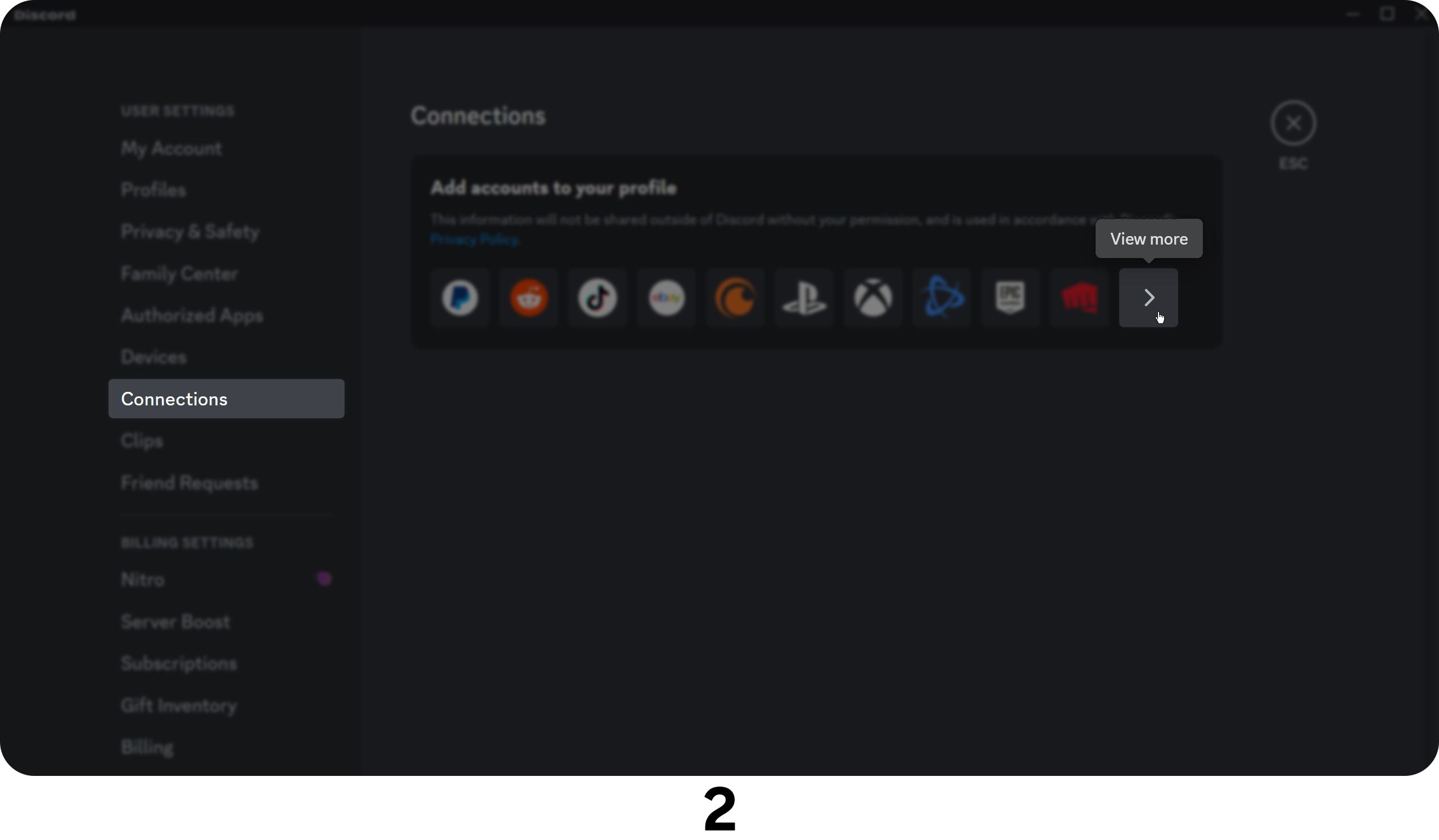 - Navigate to the “Connections” section of your user settings and click “View More” (right arrow icon)