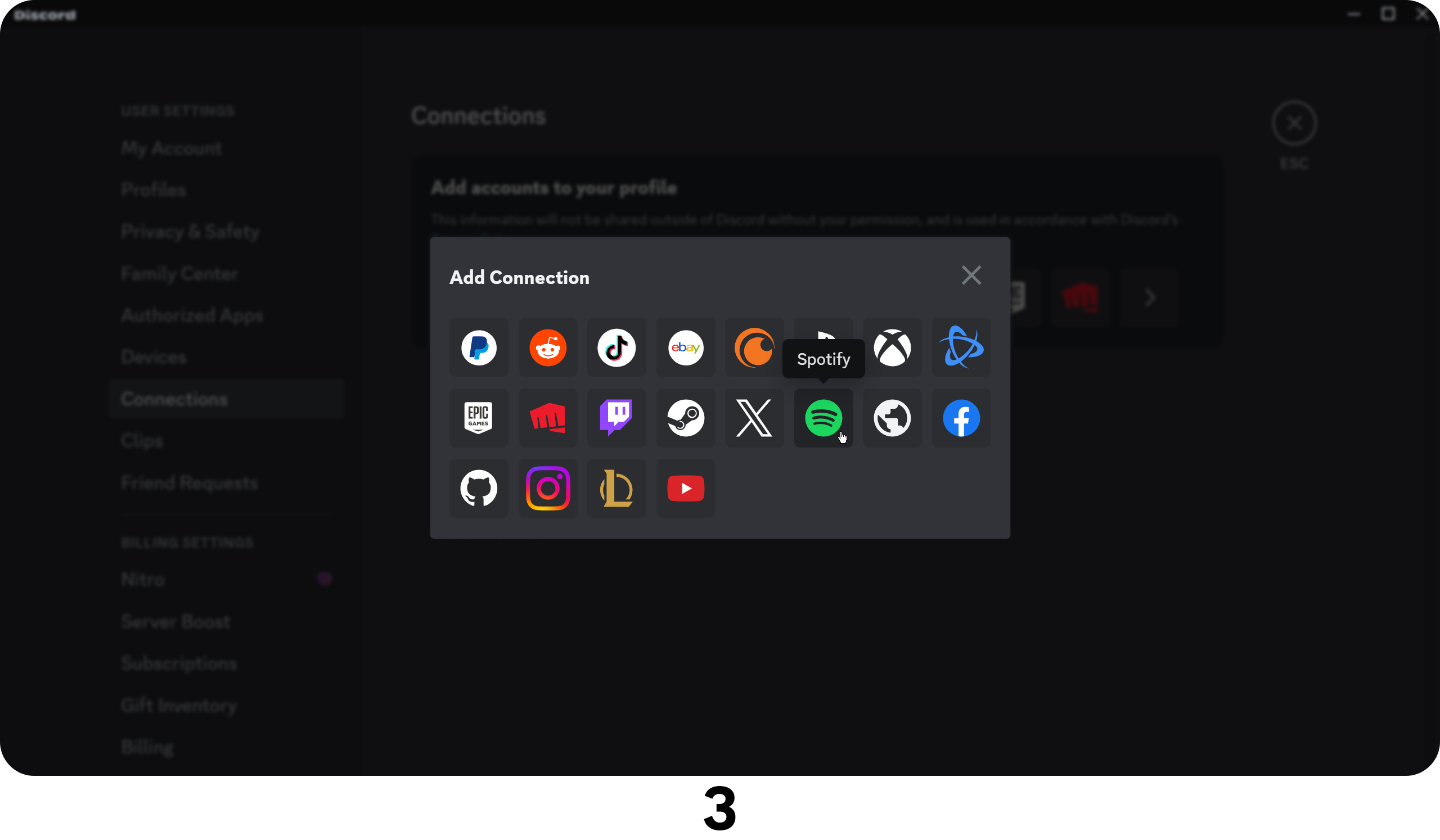 - Select Spotify from the “Add Connection” popup list; this will prompt you to log into your Spotify account and allow Discord’s access request