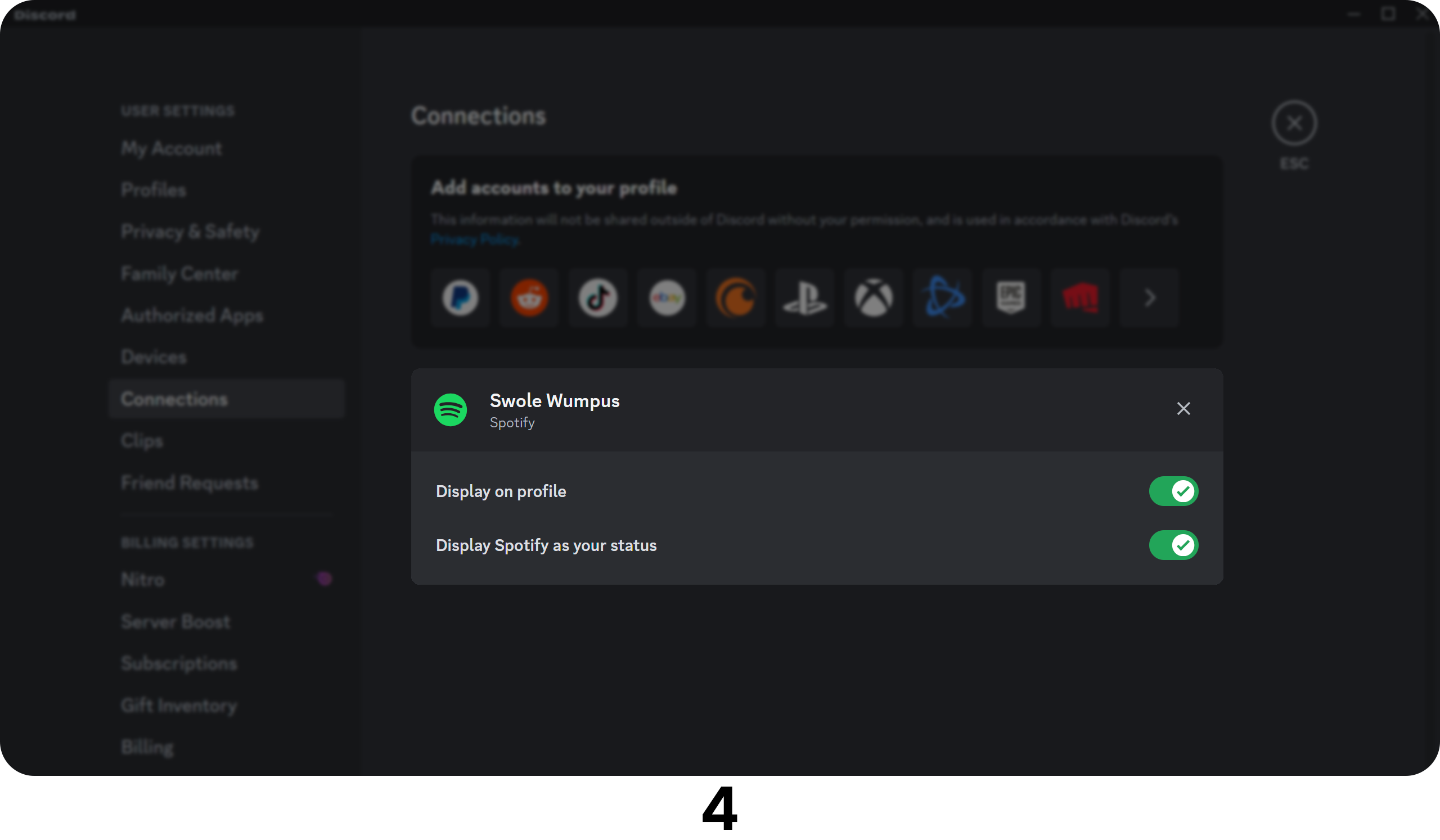 - There you go! Your Spotify account is now connected to your Discord account. You have two options: “Display on profile,” which will allow users to see your Spotify account on your profile, and “Display Spotify as your status,” which will display the songs you’re listening to in your profile as “currently listening to”
