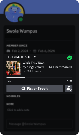 If you have the “Display Spotify as your status” option turned on, your profile will have a “Listening to Spotify” section when you’re playing a song on Spotify, which works on mobile as well. Other users who are viewing your profile will see two options: “Play on Spotify,” which will trigger their Spotify to play the song you’re listening to, and “Listen along,” (a person with a play icon) which will sync their Spotify to yours and they will listen along you even if you change songs. This will keep on going until the user leaves the “listening party.”