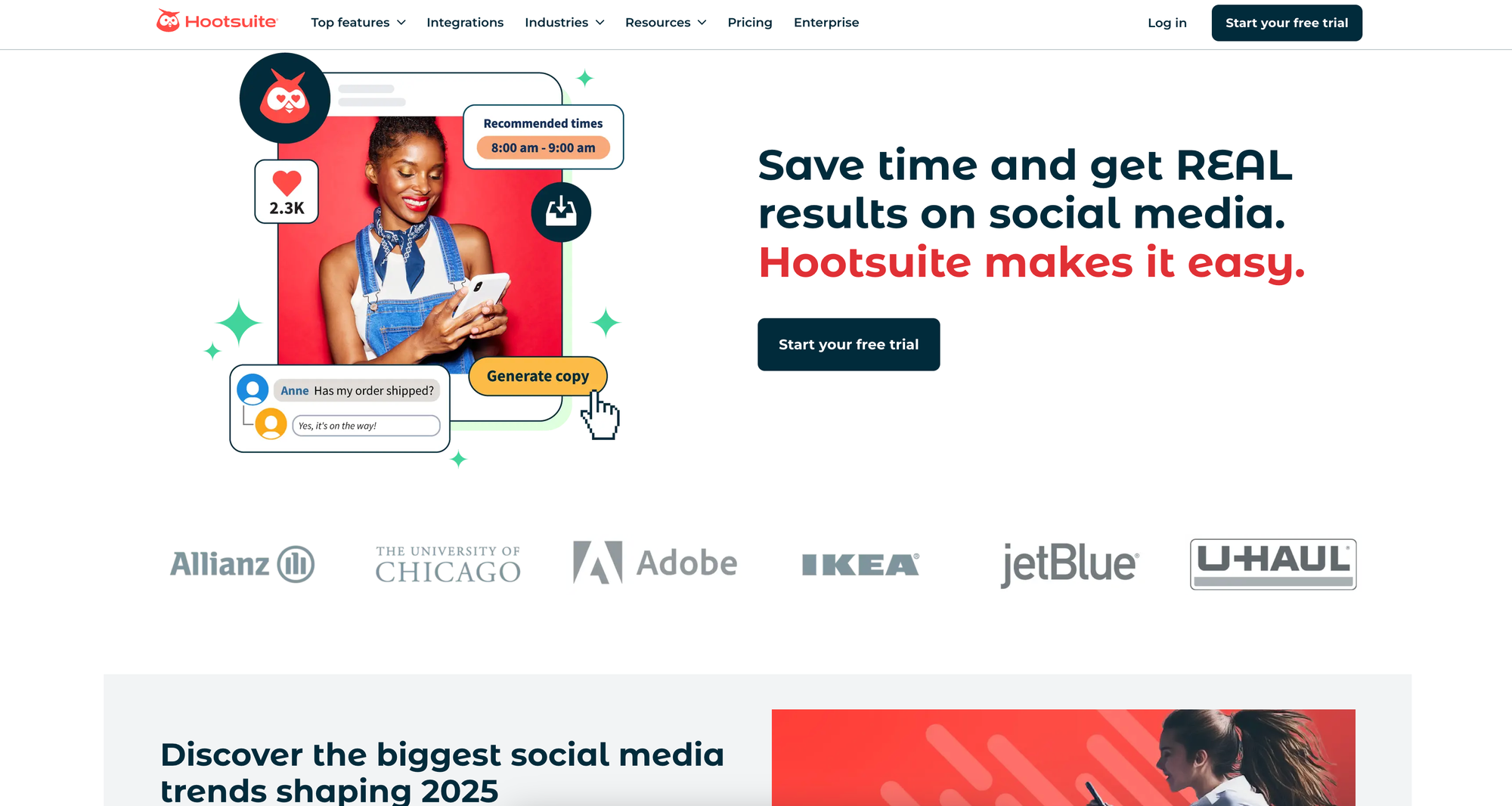 Hootsuite is a user-friendly social media management platform that focuses on automating the entire operational process of running a social media account. Whether it’s publishing and scheduling, creating AI-powered content, or analyzing engagement and reporting on the best times to post for specific audiences, Hootsuite automates all of these processes across all the major social networks.