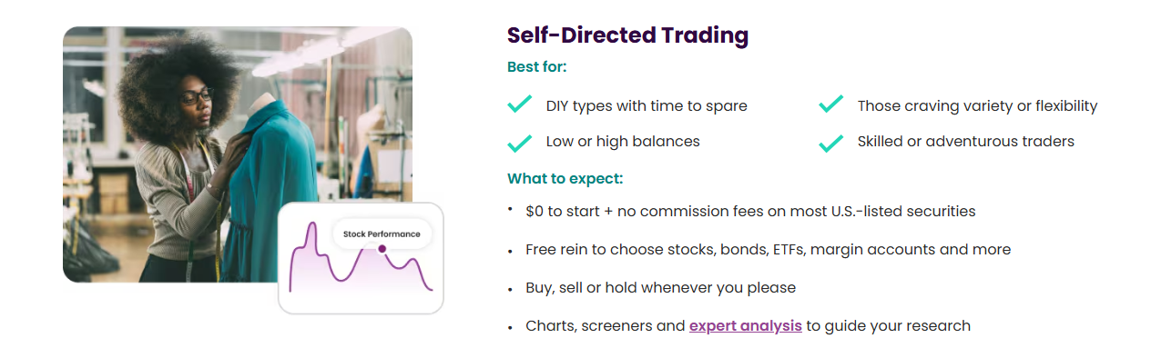 - Zero commission trading. Ally Invest is as good a broker as any for fee-free trading if all you want to do is buy stocks and ETFs. A self-directed trading account gives you the ability to do that without worrying about too much else, but the moment you move into robo trading or other assets, fees start to become a factor.