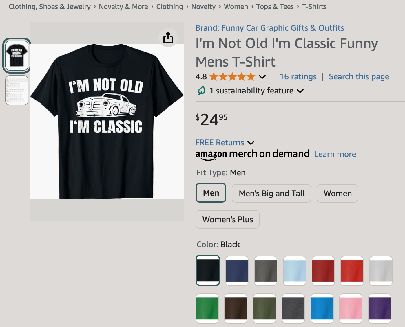 A graphic tee with a funny phrase or pun–particularly one catered to a middle aged or older audience–might not be appealing to you, but can perform surprisingly well on Amazon.