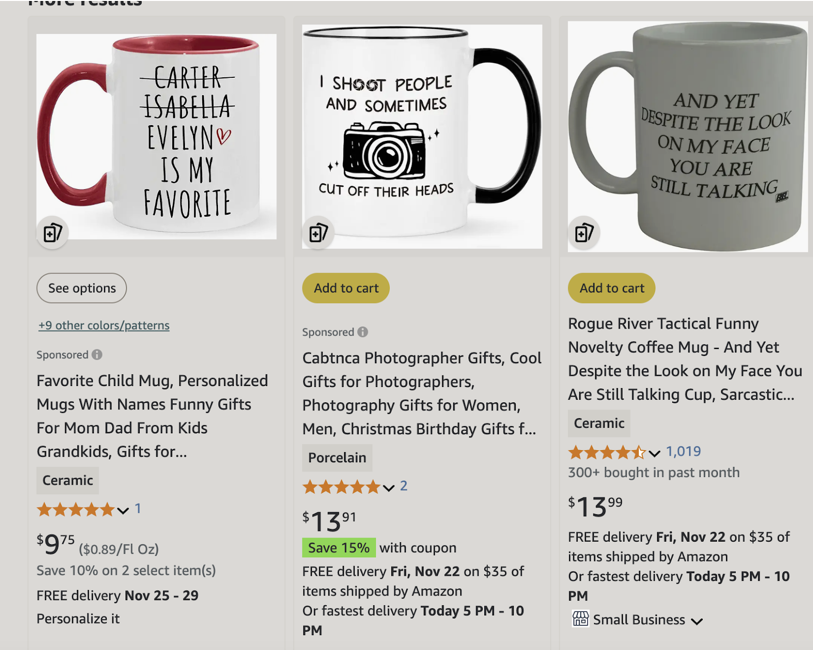 Another solid performer that has potential for high volume is a coffee mug with print on it. Since becoming eligible as a product on Merch on Demand, these have exploded in popularity with people giving these as gifts or getting them for themselves.