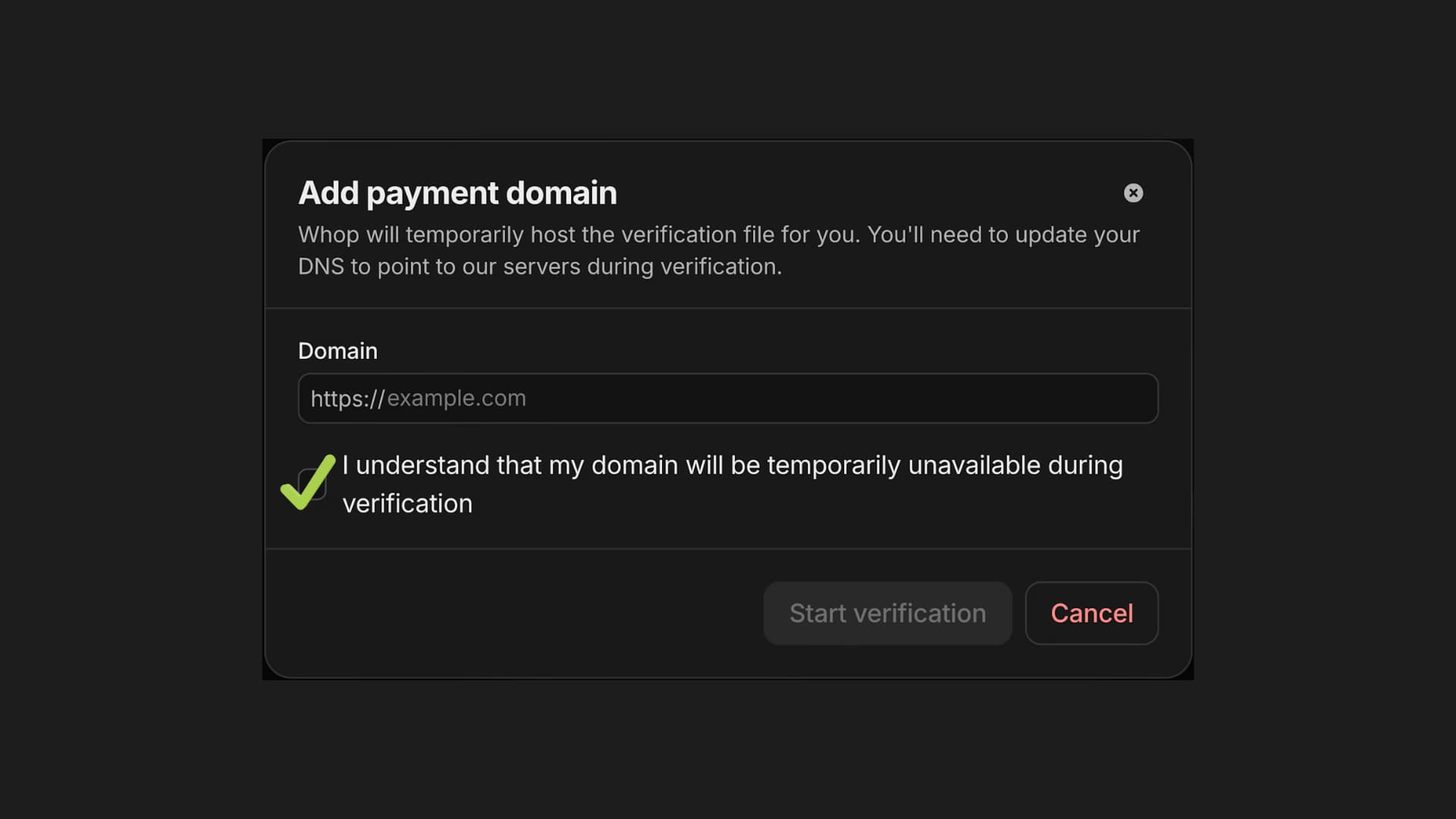 Acknowledge that temporary downtime will occur, as your domain will point to Whop’s servers until you revert the DNS records after verification.