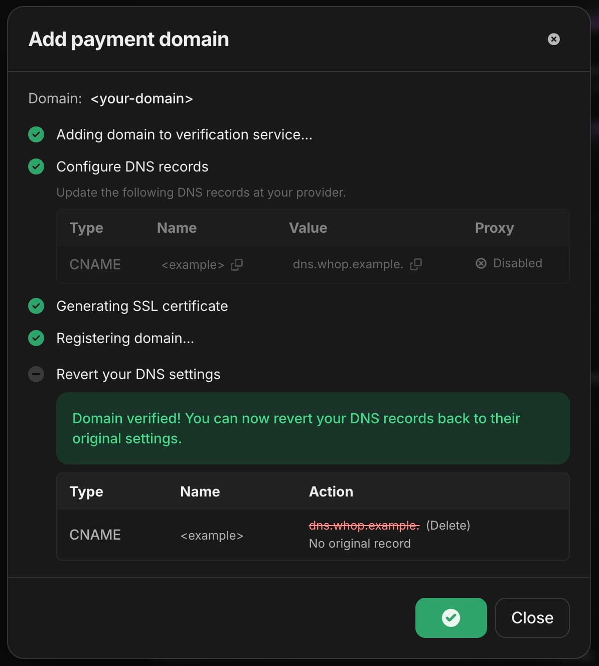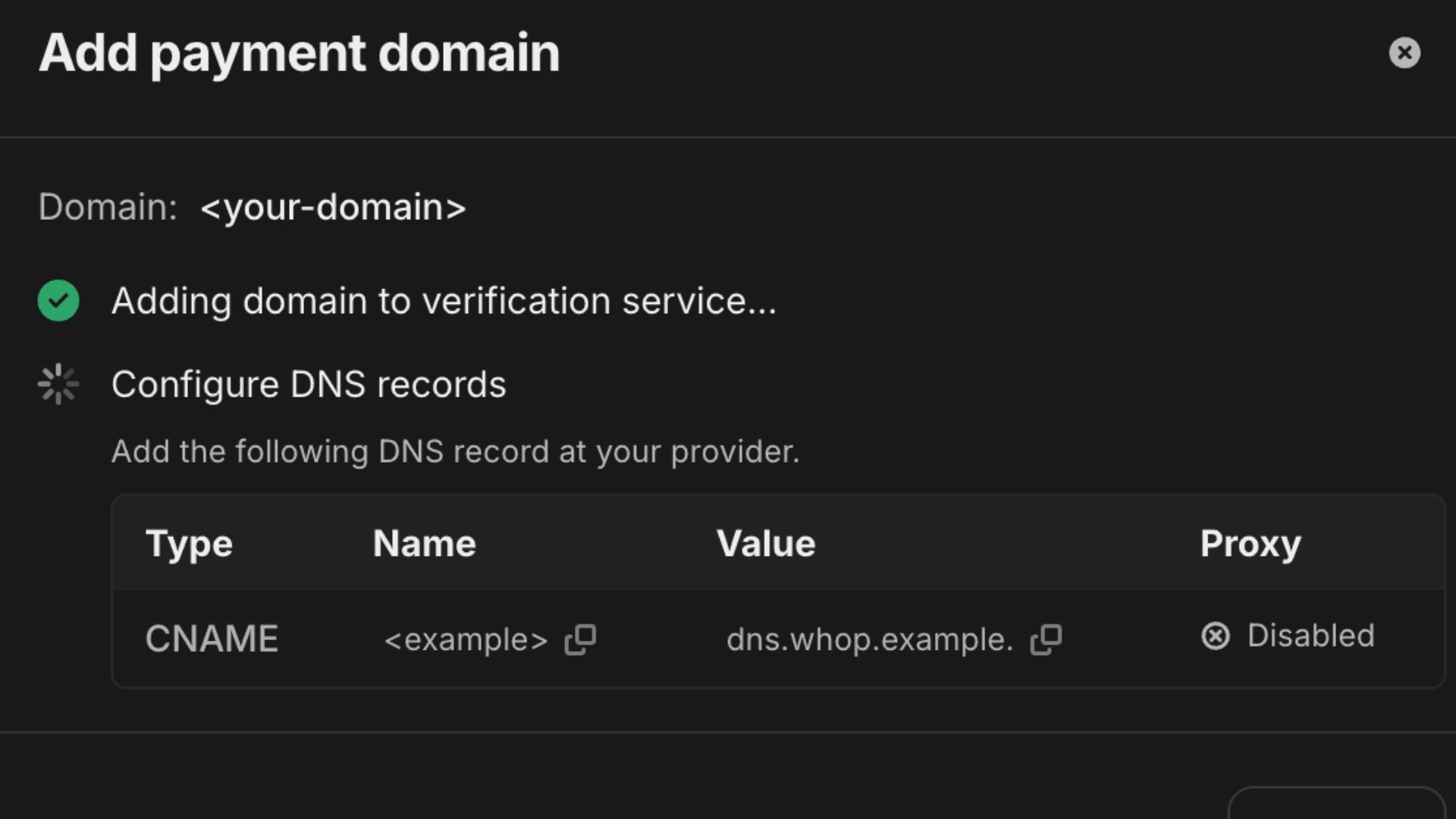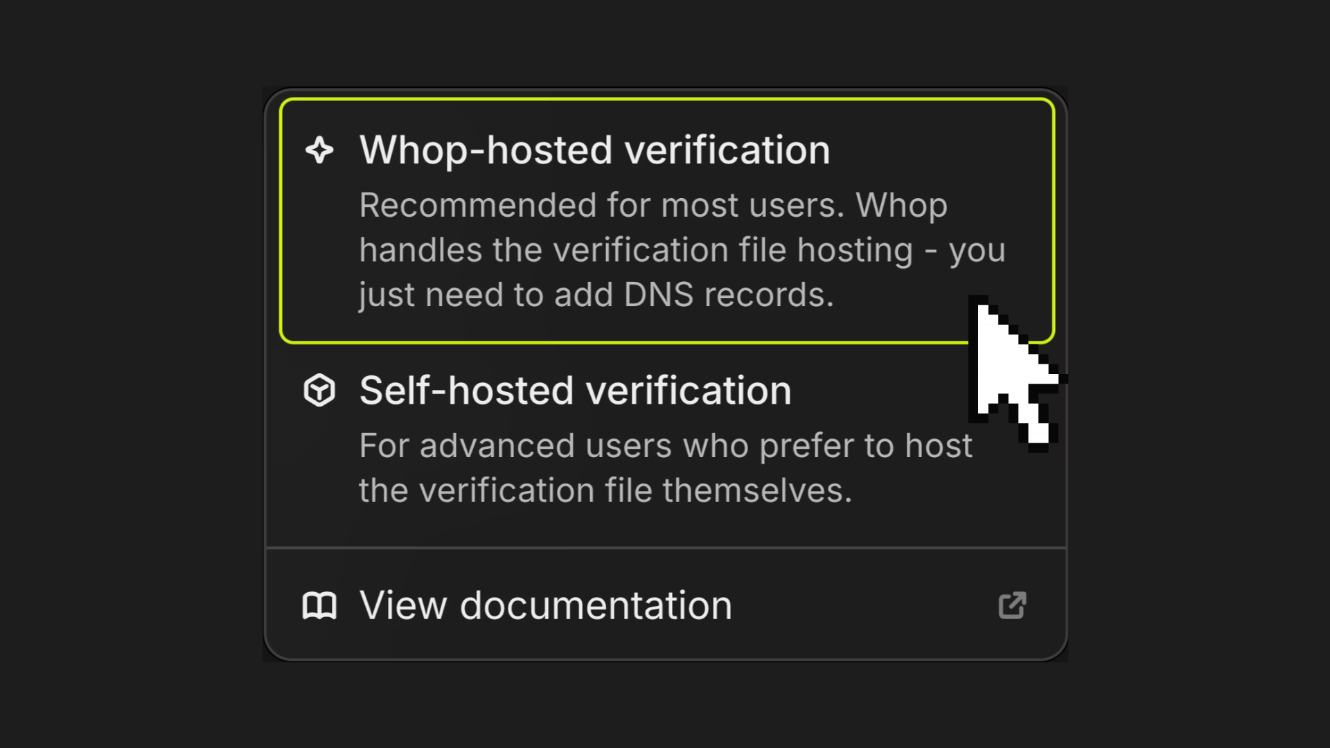 - Whop-hosted verification: Whop handles the verification file hosting, you just need to add DNS records.