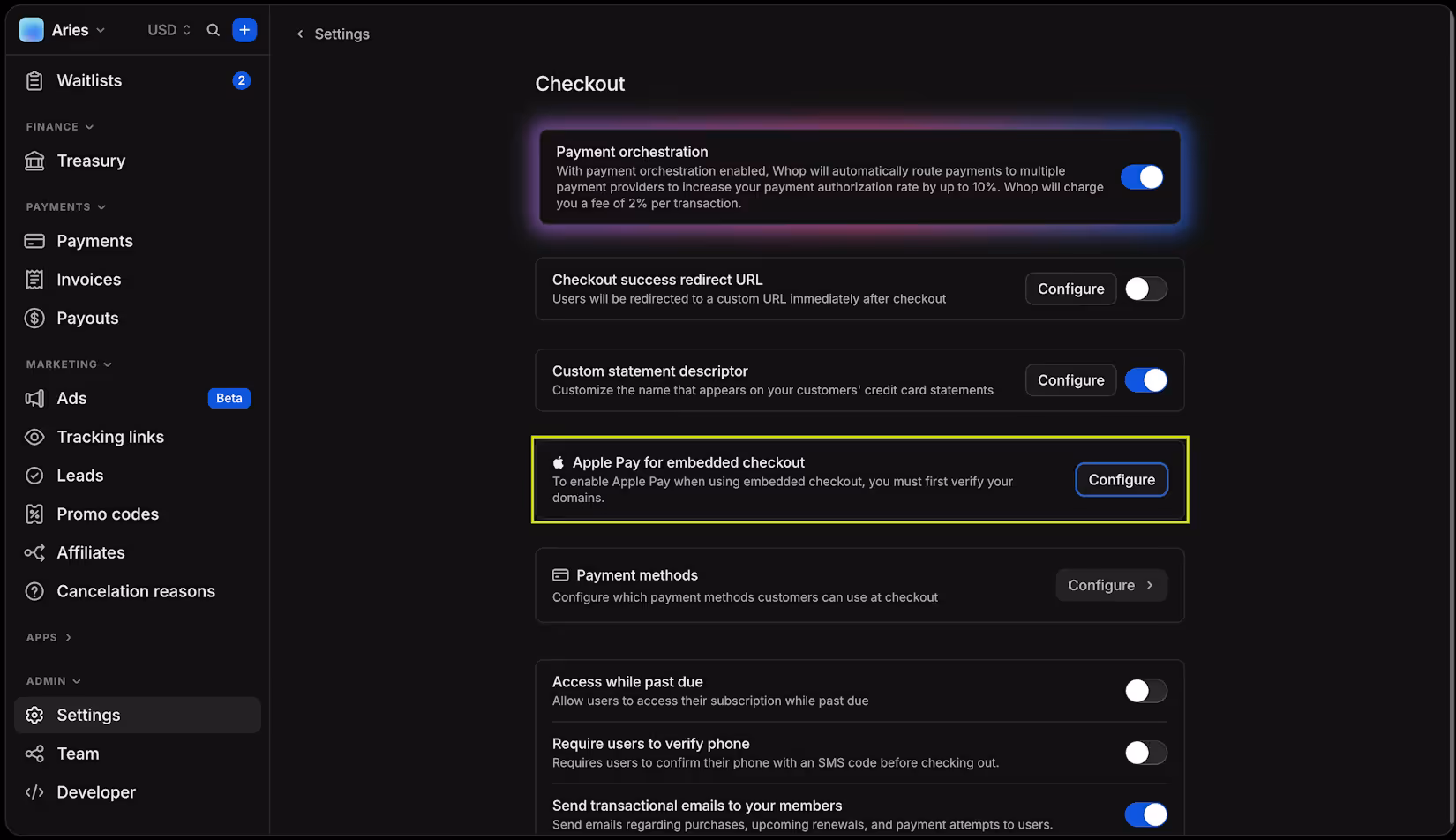 Go to Checkout settings in your Whop dashboard, and find Apple Pay for embedded checkout. Click Configure.