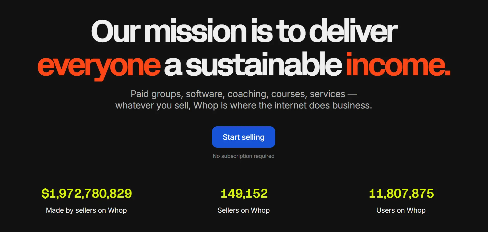 Join the next generation of online entrepreneurs. Start selling on Whop today.