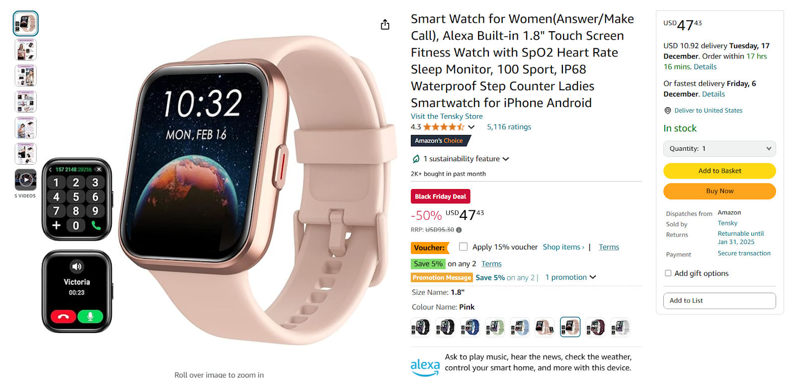 For example, this smartwatch from Tensky on Amazon has been sold over 2,000 times in the past month.