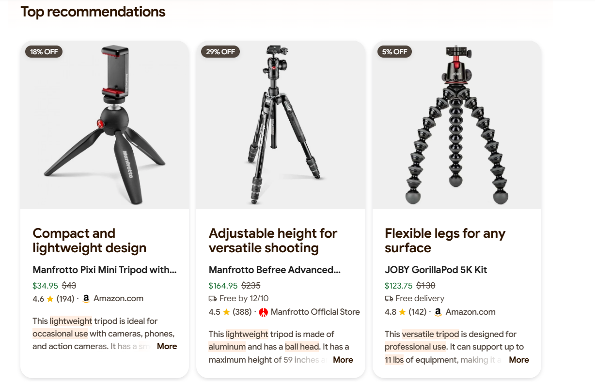 Naturally, it’s remained consistently popular as a search term. As seen by these recommendations on Google Shopping, phone tripods vary in terms of pricing. The cheapest models sell for under $10, but more professional options like the JOBY GorillaPod 5K Kit (pictured below) sell for over $120.