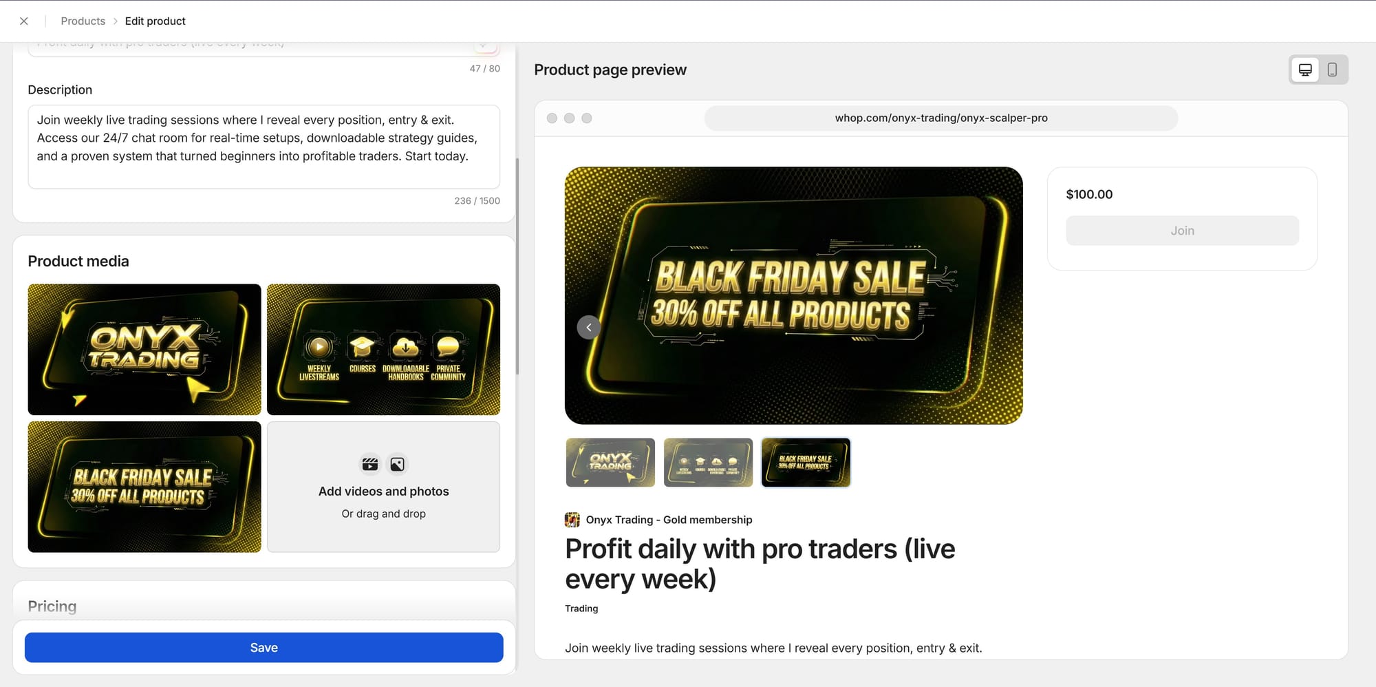 Since you have total control over your product pricing on Whop, it’s super easy to create discounts for special occasions - like Black Friday and Cyber Monday.