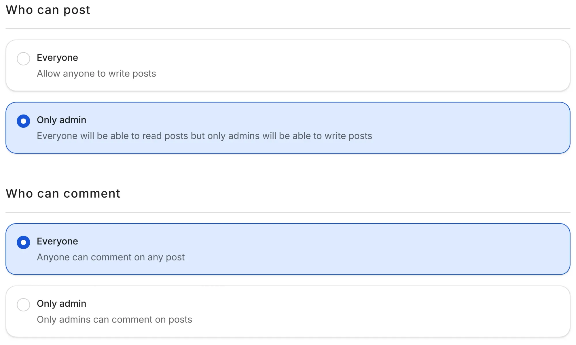 Once you see the two settings, select Only Admins options on both so that only admins of your whop can post and comment on the app.