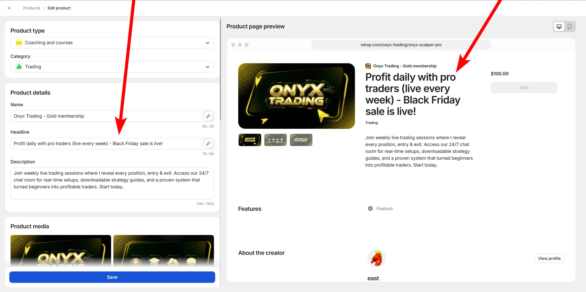 Promo code? Check. Now, it’s time to let your potential new members know that there’s a sale on your products, and the best way to do so is by editing your whop’s store page.