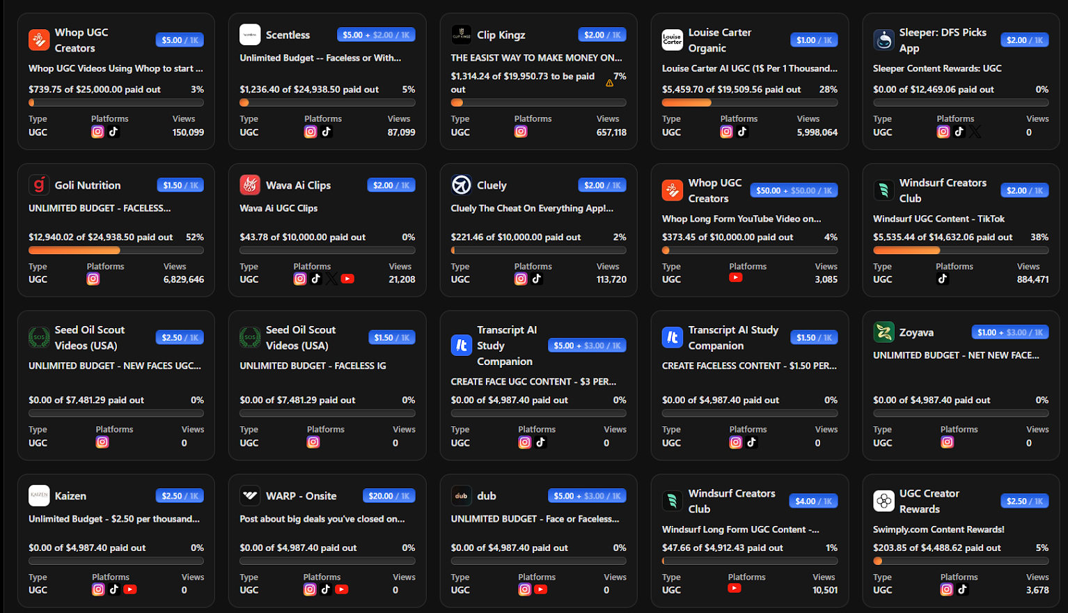 Here you will see hundreds of brand campaigns for UGC. Each campaign has a clearly defined budget, shows how much you'll get paid per 1k views, and outlines the platforms you can use for your UGC.