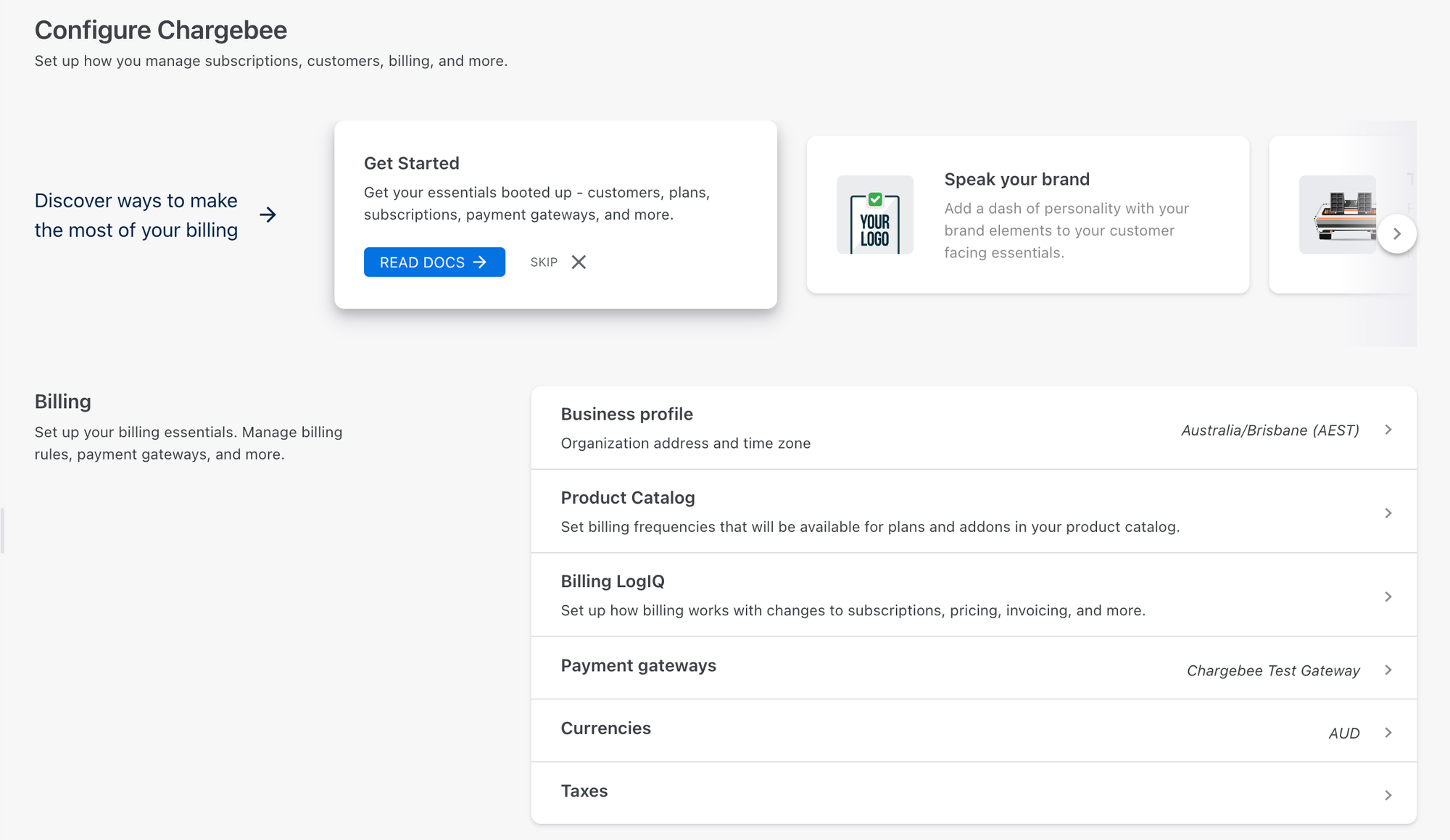 Chargebee doesn’t process payments directly — you’ll need to connect a gateway under Configure Chargebee → Payment Gateways. It integrates with 30+ major providers across 150+ countries, including: