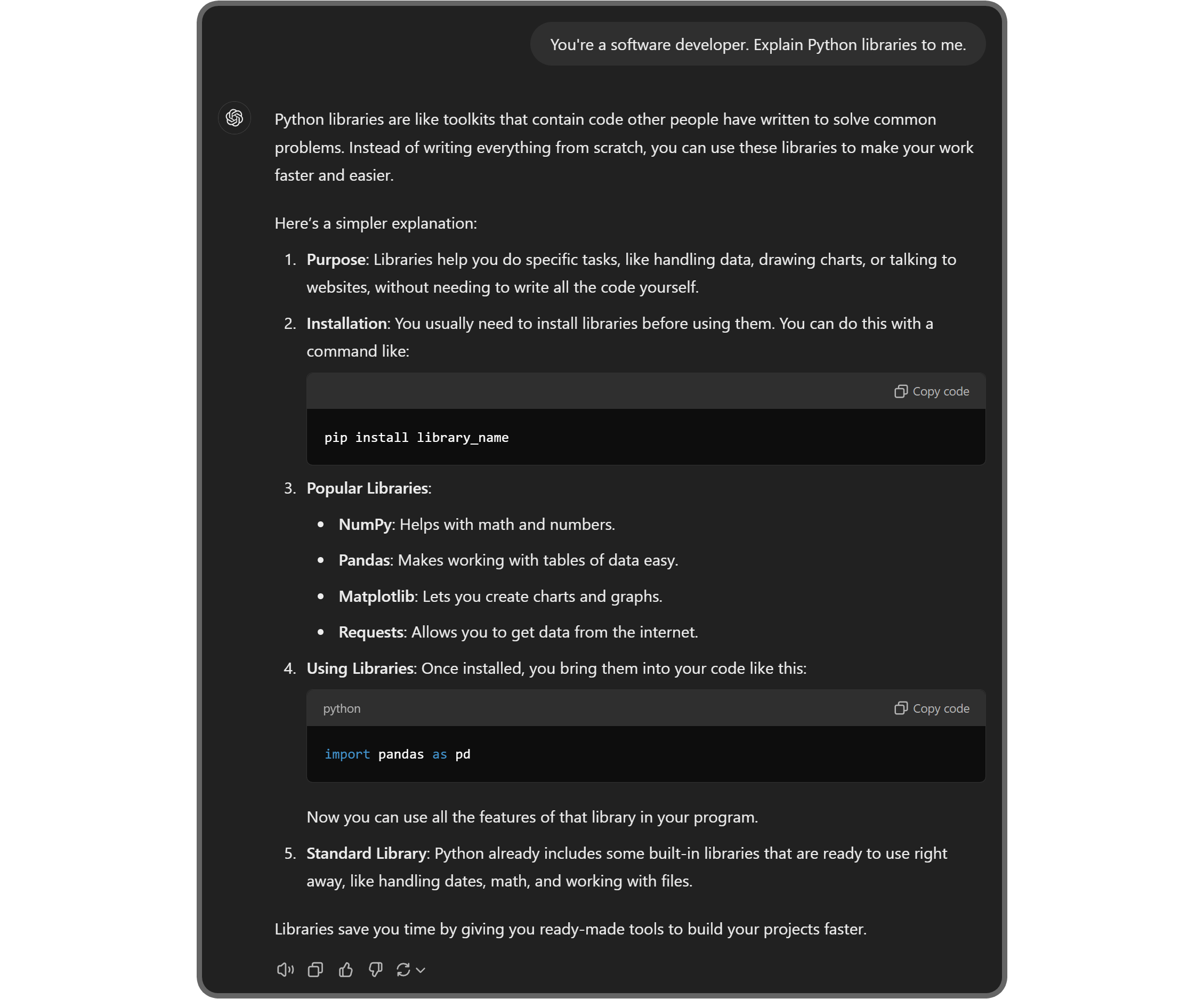 When you tell ChatGPT that it’s a software developer, its answers are going to be much more technical, almost like you’re actually talking to a software developer. This allows you to have natural conversations in the terms you want to. This is one of the most popular techniques for improving ChatGPT’s efficiency.