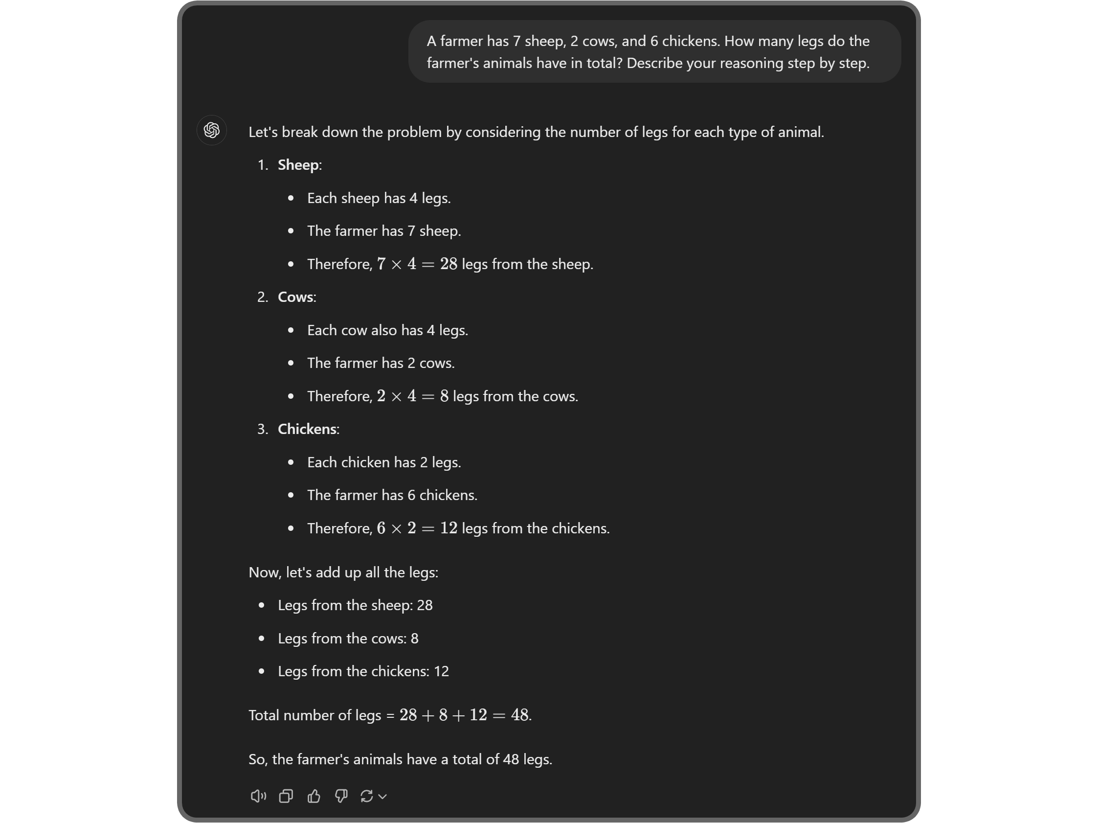 Chain-of-Thought prompting is a very popular way of improving the output you get from ChatGPT. As its name suggests, CoT prompting triggers ChatGPT to tackle questions by breaking them down into multiple steps. Smaller steps help ChatGPT understand the context and where it is in the process of solving your problem. For example, when you ask ChatGPT a simple “how many apples did I have left?” question, it’s most likely going to try to explain that on the go - but instead of that, if you ask the question, but tell it to break its reasoning down to multiple parts, it’s going to give you a much better output, possibly reaching the correct conclusion. Of course, ChatGPT isn’t really that great when it comes to math since, as we mentioned, it just predicts the next word.