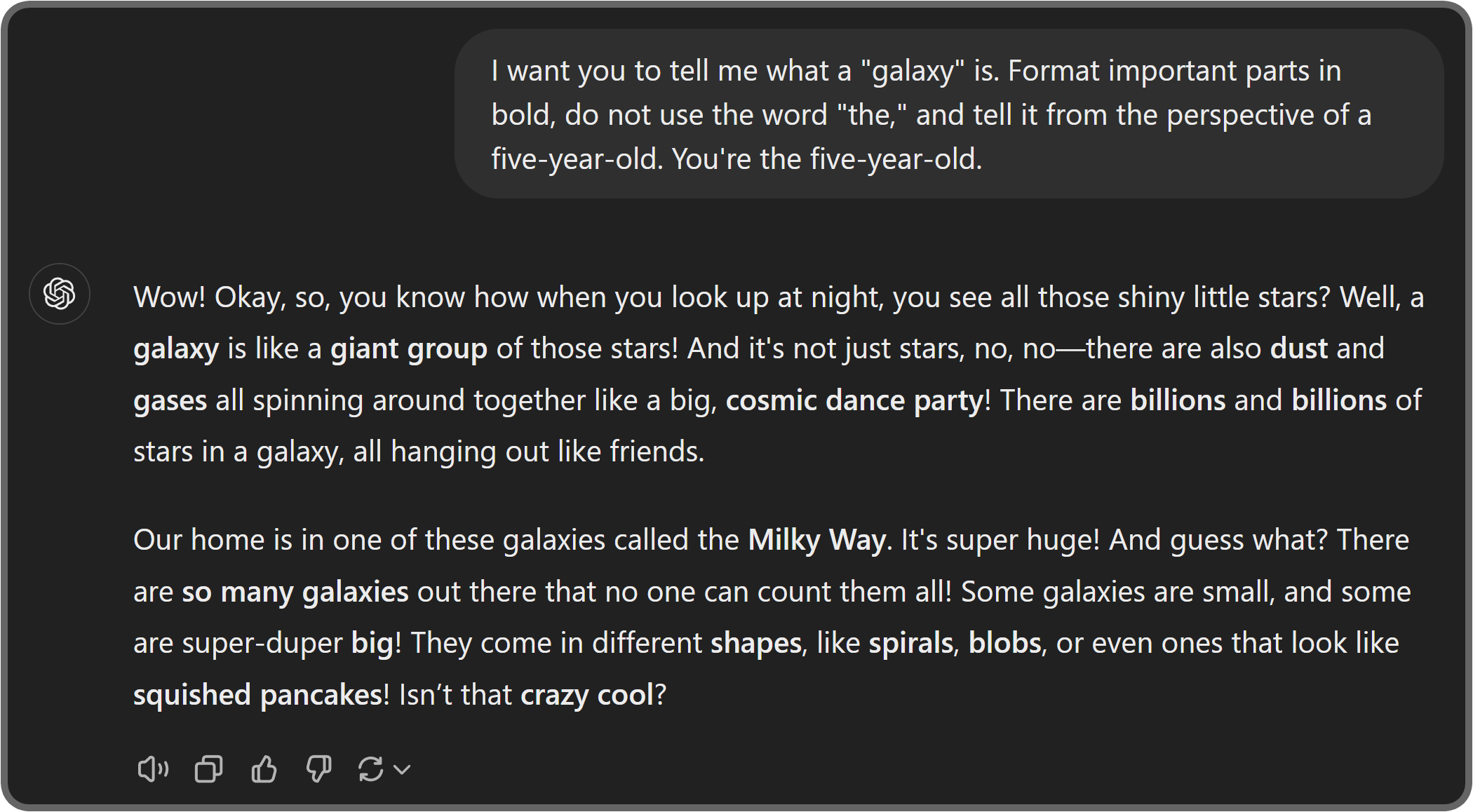Since ChatGPT is an LLM, it takes every word you add to your prompt into question. If you ask a question that ChatGPT can potentially stray away from the main topic while answering, you just lost yourself precious time of watching ChatGPT type out your answer, although it’s pretty entertaining. Specifically, narrowing down what kind of response you want is the best way to get the answer you’re looking for from ChatGPT. As we mentioned a couple of times in this article, the more detailed the prompt, the better the output - but of course, that doesn’t mean you should dump information into your prompt because that might confuse ChatGPT.