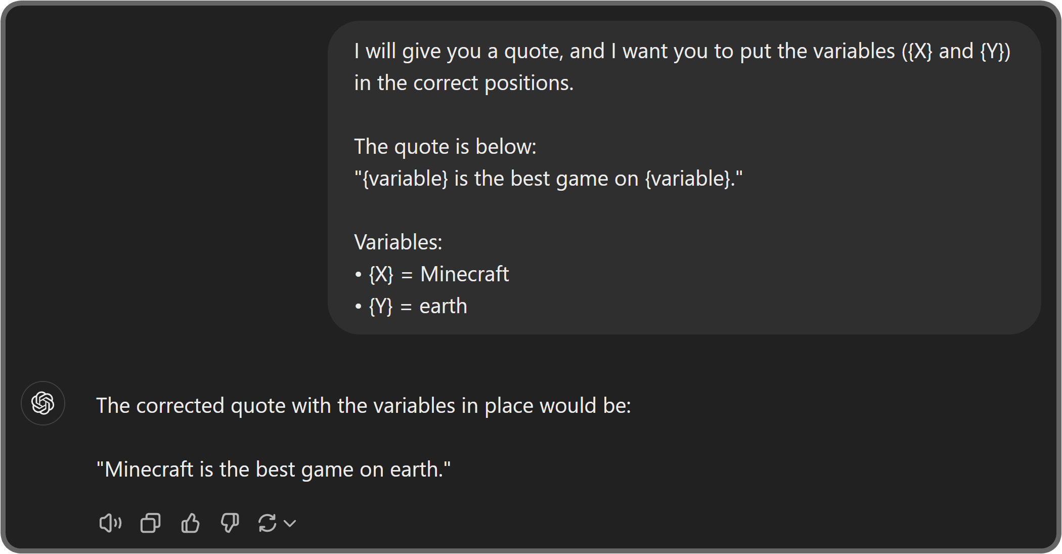 - If you’re using variables, let ChatGPT know that when you type {X} in the rest of your prompt, it’s a variable.