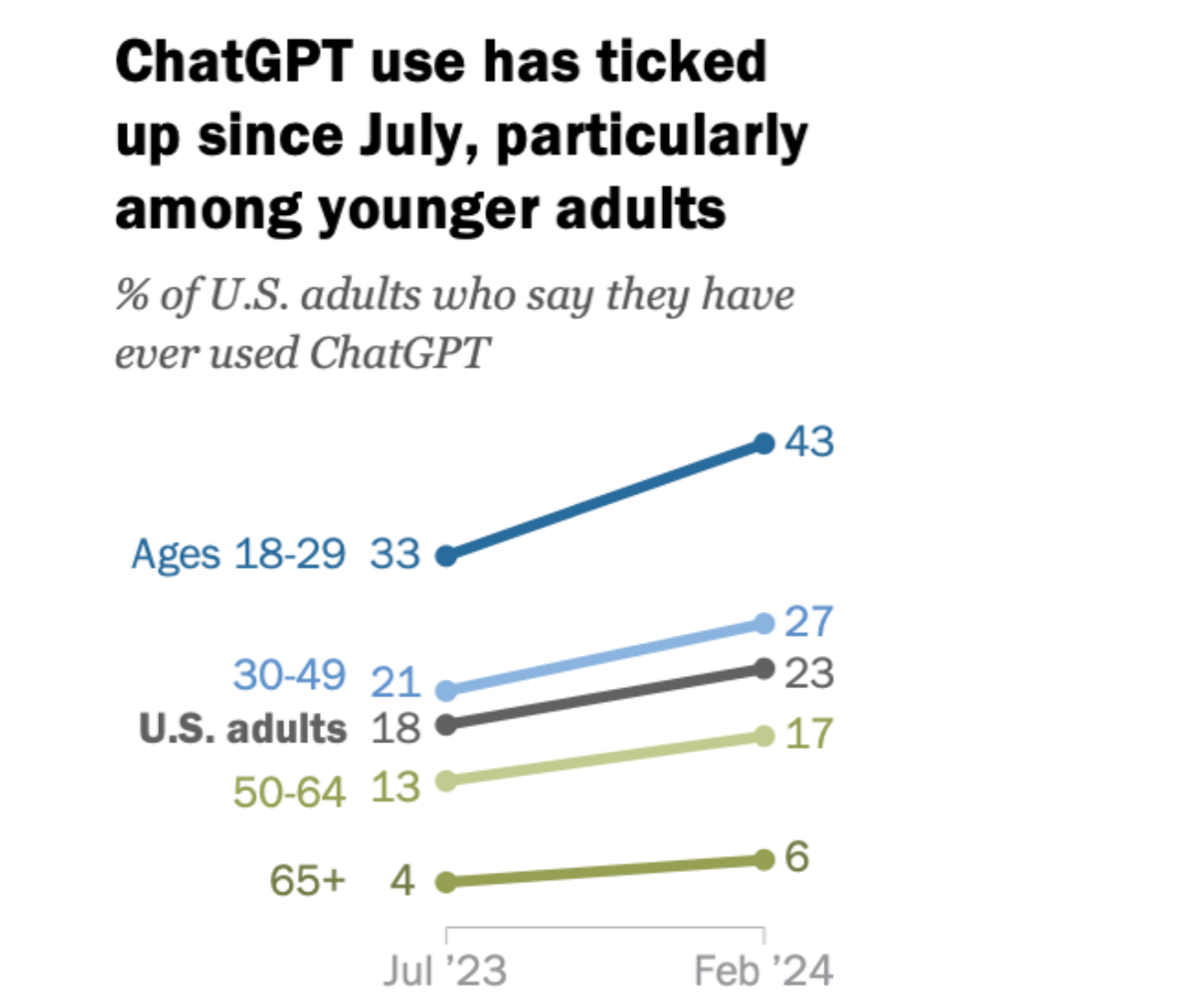 Overall, for adults under 30, the use of ChatGPT for work was much higher at 31% and represented a 14% increase from 2023.