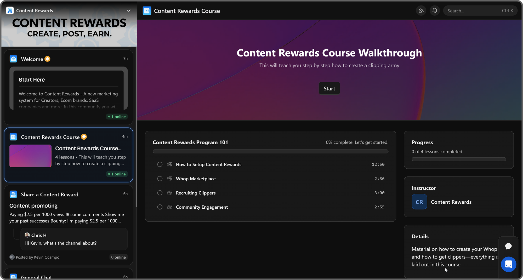 Any brands wanting to learn how to start their own clipping rewards program, following a bespoke, step-by-step course created by Whop.
