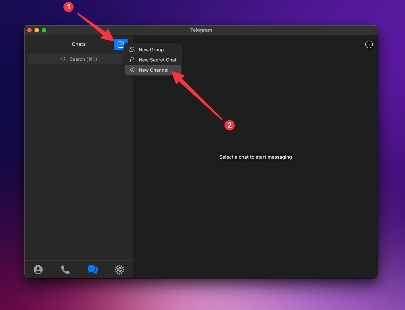 First, navigate to the “Chats” tab on the Telegram desktop application. Then, click the icon next to the “Chats” heading (1) and a submenu will appear.
