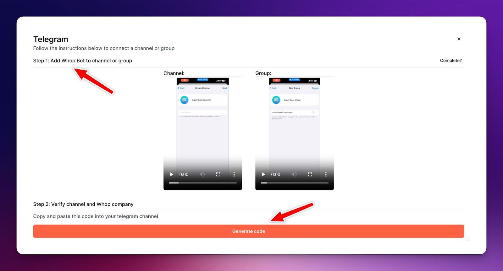 Step 6: Click “Generate code” and enter the code into your Telegram channel’s chat. Whop Bot will see this and set everything up on your dashboard almost immediately.