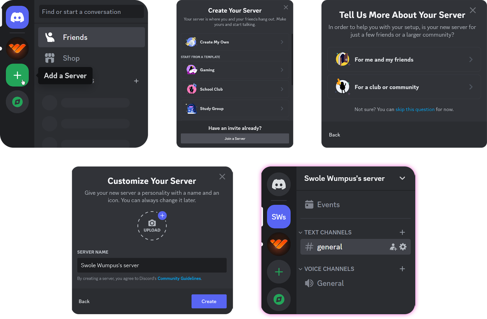 - The next step is choosing your server type, either private ("For me and my friends") or public ("For a club or community".) Your selection in this step won't make a functional difference, so choose what you want. You can skip the question by clicking the blue "skip the question" text below the buttons.
