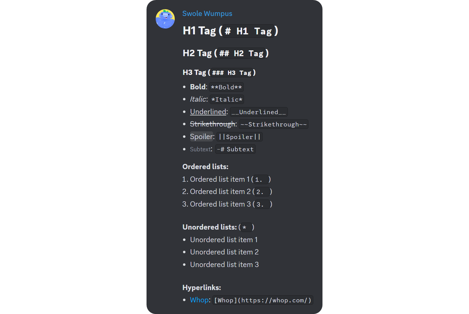 Discover Discord Markdown! Use Discord markdown to add style to your messages. Whop explains how you can create headings, format text, use hyperlinks, and share code snippets within Discord.