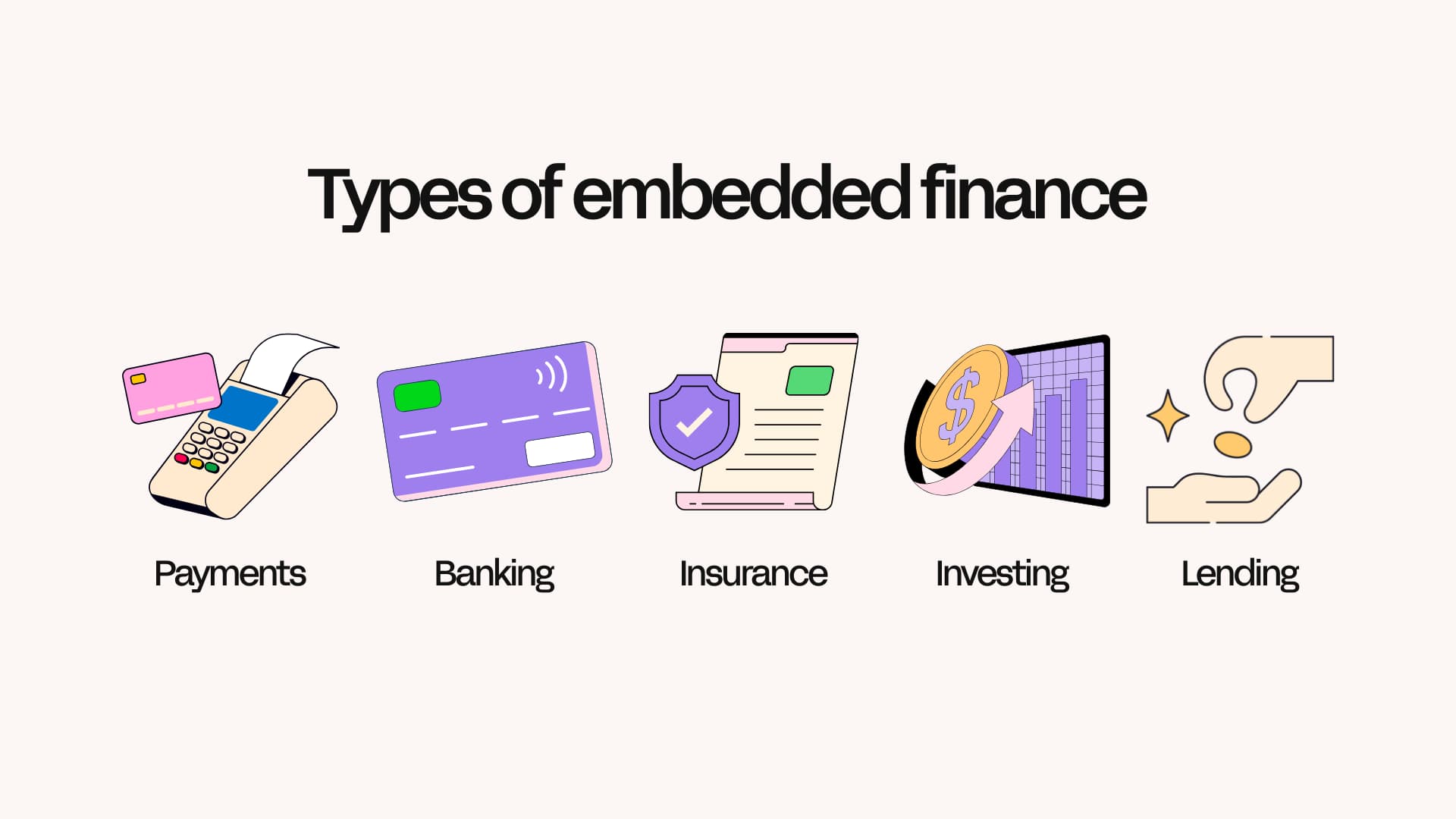 The five main types of embedded finance are embedded payments, embedded banking, embedded lending, embedded insurance, and embedded investing. Each work to allow platforms and marketplaces to monetize the flow of money.