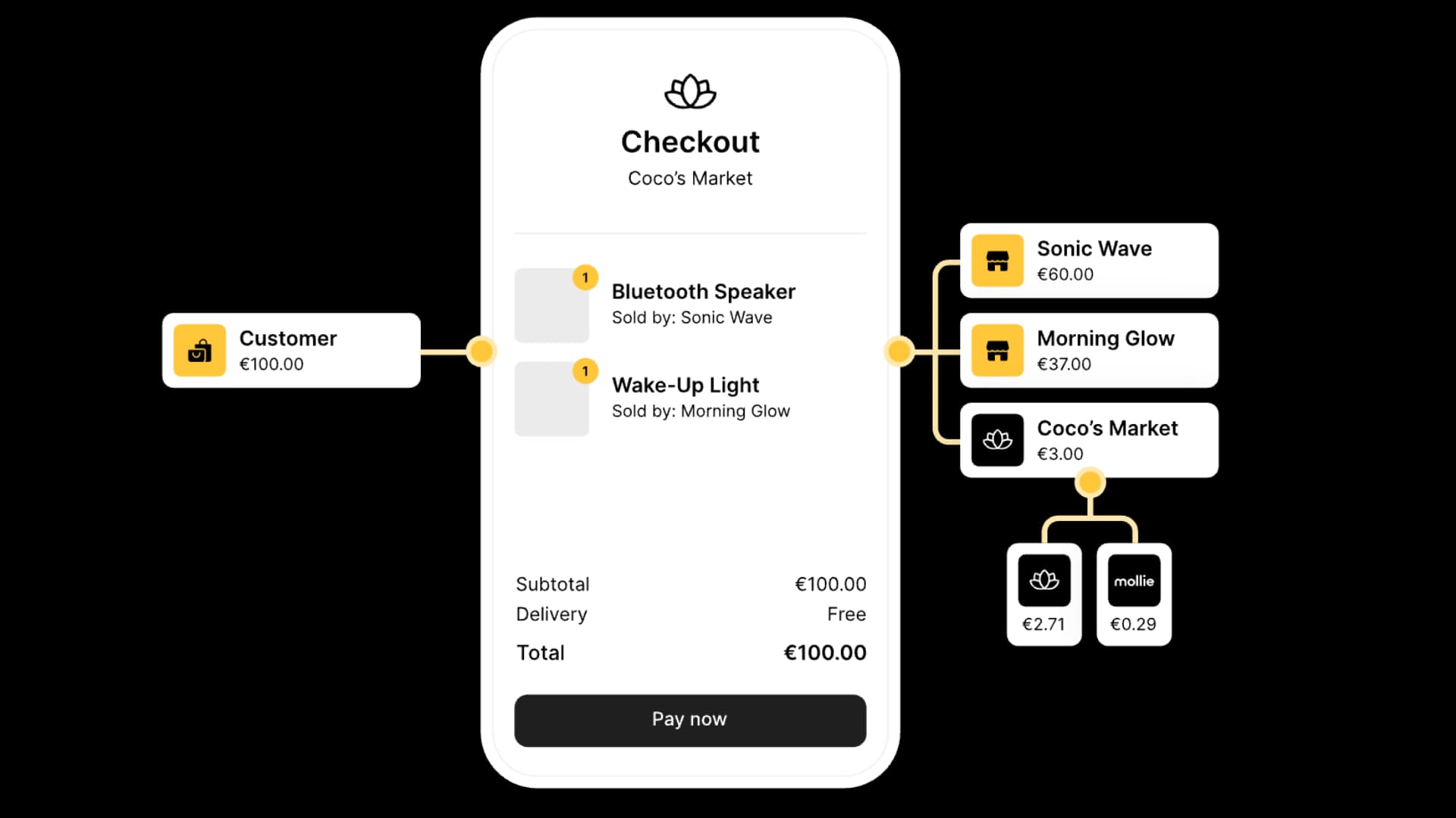 Marketplaces can onboard sellers with compliance checks and automatically route payments and payouts.