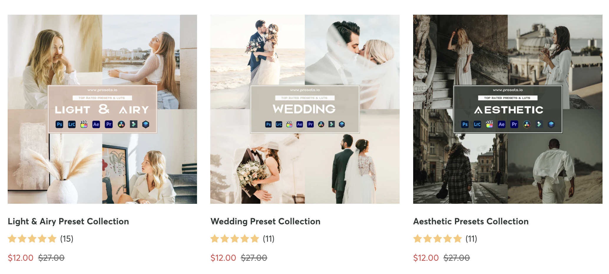 Another common, evergreen, and passive digital product is Lightroom presets. These are products that you can create once and sell over and over again. You can even create bundles for different events, like weddings, holidays, and travel.