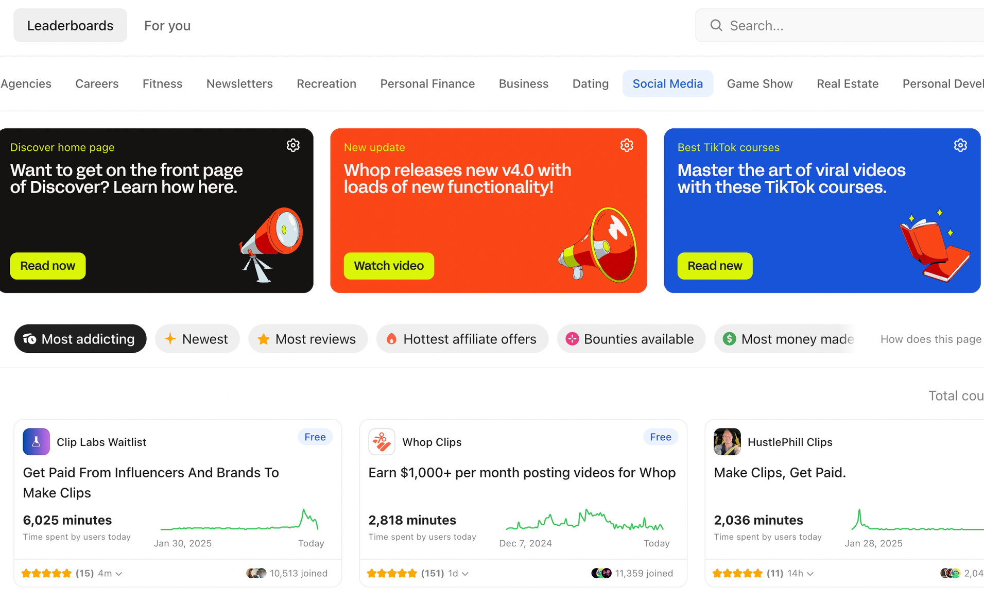 If you want to gain insights from faceless TikTok account success stories, then check out Whop. Whop is stacked with help from those who have been there and done it. Many courses are free to try.