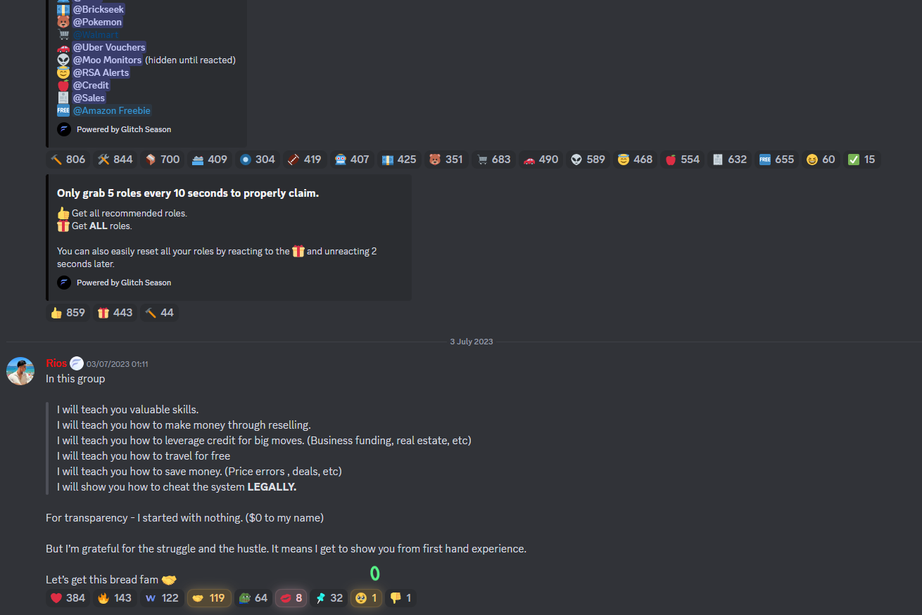 Even beyond deals for reselling and dropshipping or cashout, Frugal Season can help you be your best frugal self in a number of other ways. The group runs calls helping members to understand personal credit and areas like credit repair, and they’ve got dedicated Discord channels covering credit offers, various bonuses, finance, real estate, and travel.