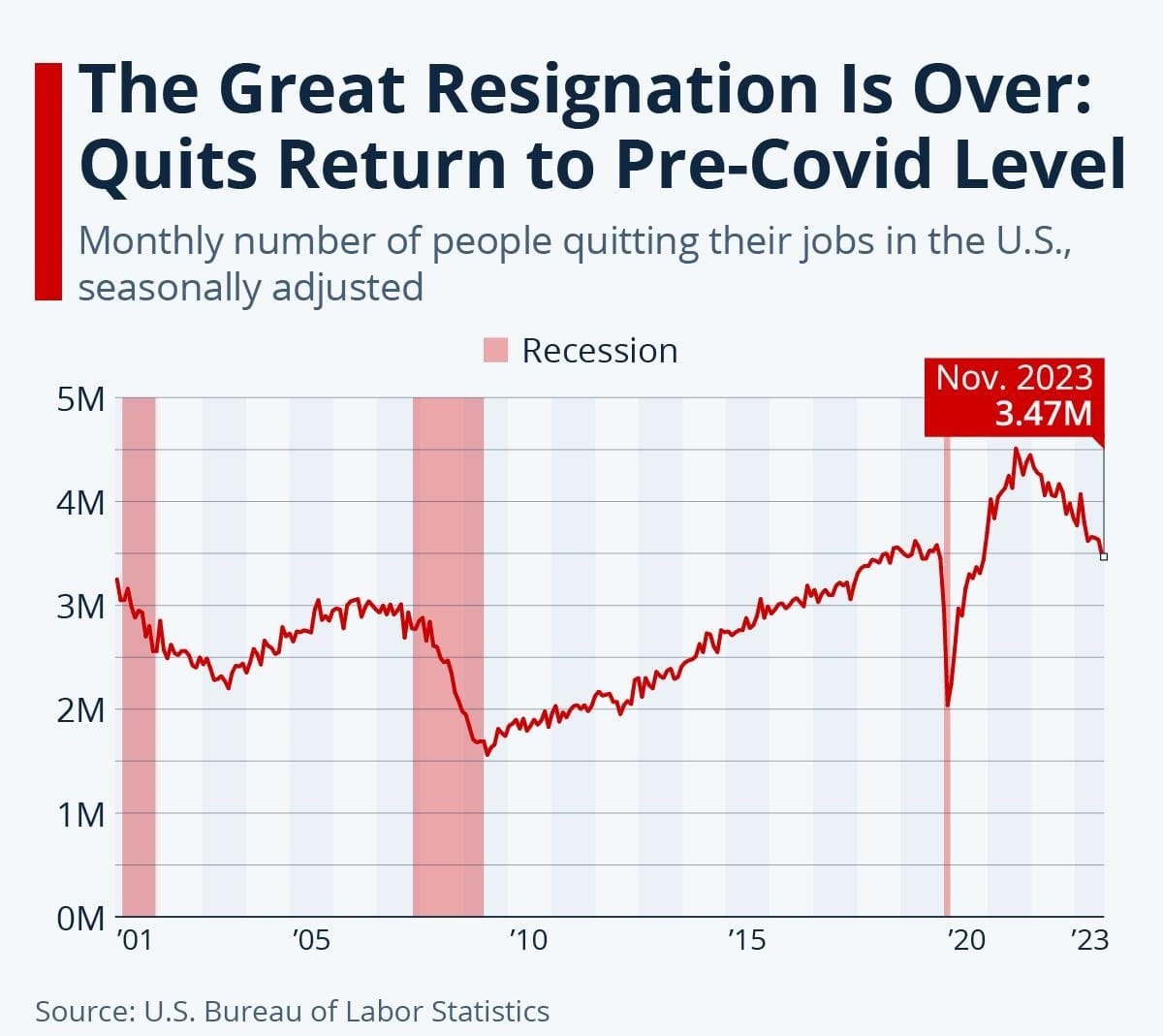 In 2022, more than 50 million Americans participated in the Great Resignation. After peaking between November 2021 and April 2022, when almost 4.5 million people quit on average per month, the movement started to lose steam throughout 2023.
