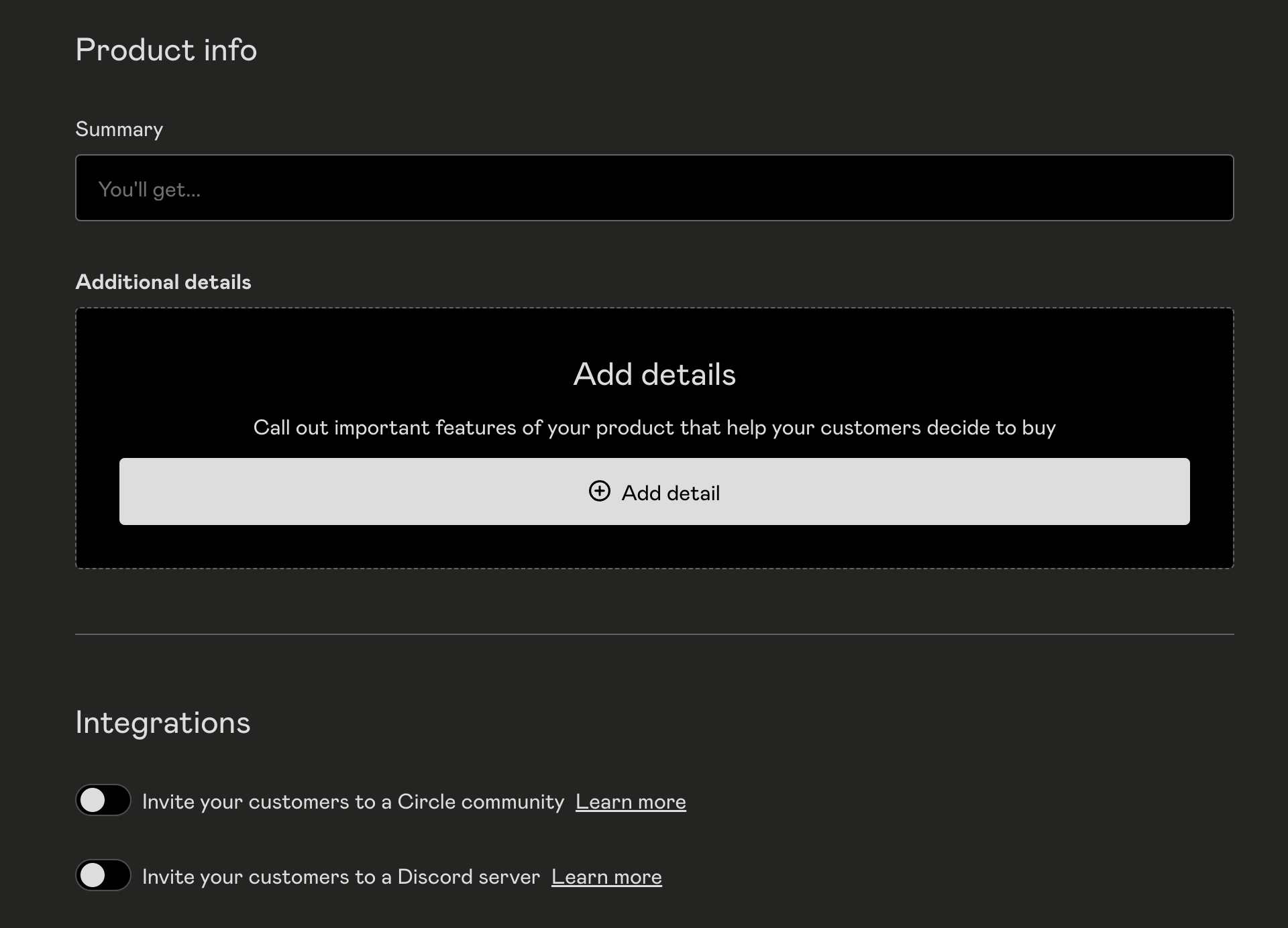 On the same page, you can add the summary of your product and any additional details for potential customers to read through. Then, you can integrate your Discord or Circle community with Gumroad.