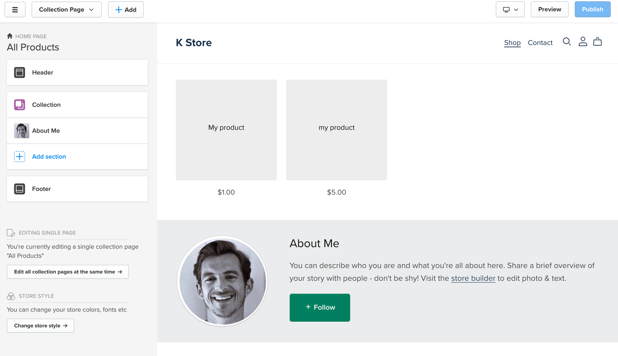 In this section, you can customize everything from your about me, to your store style with colors, fonts, buttons, favicons and themes, and even edit the aspect ratio, number of columns, and spacing of your page.
