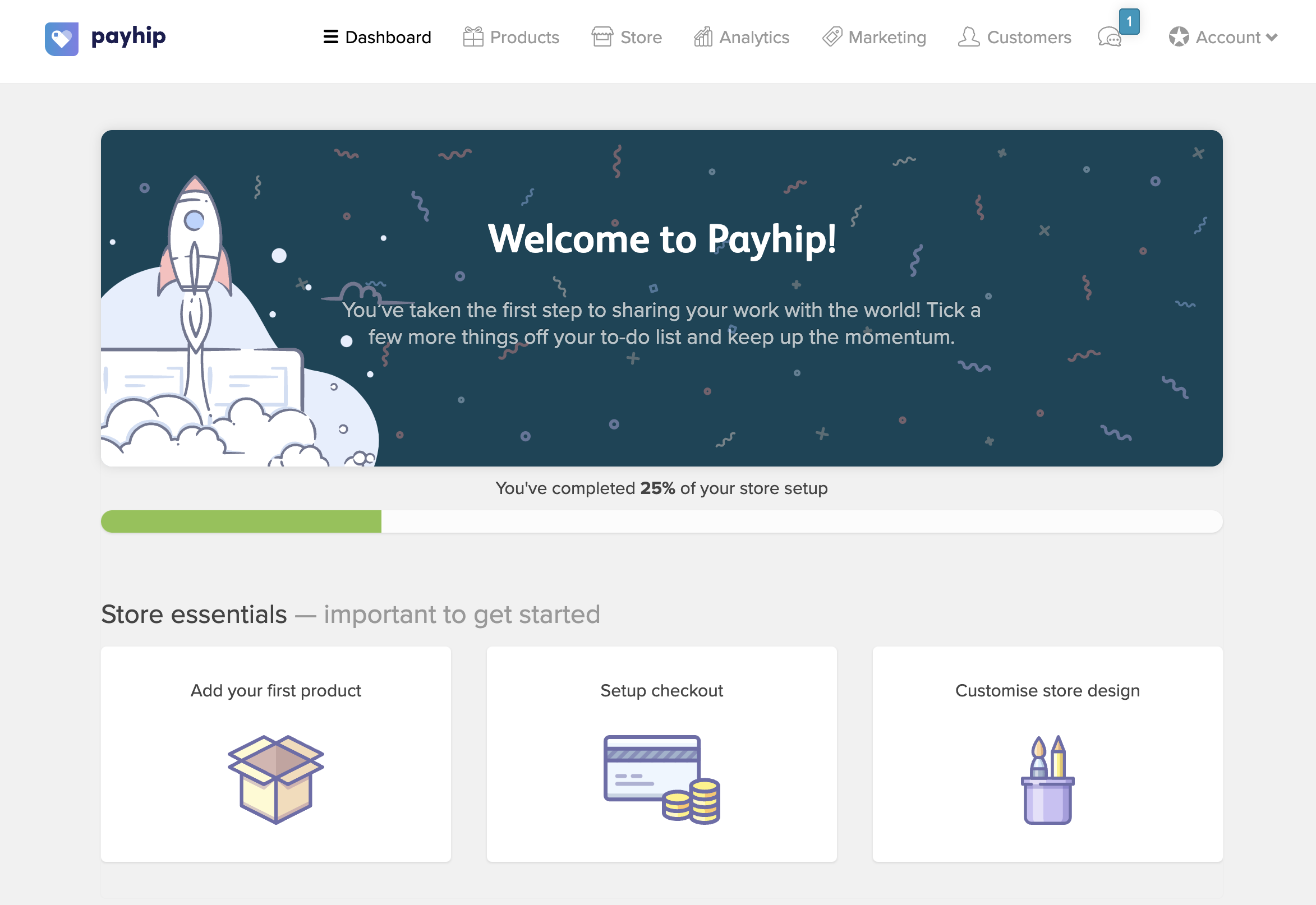 Like Gumroad, once you've created your Payhip account you are brought to your seller dashboard. The dashboard is clean and easy to read, highlighting the steps that you must take to set up your online store. The store setup bar is a nice touch too, showing you how far along you are on your ecommerce journey