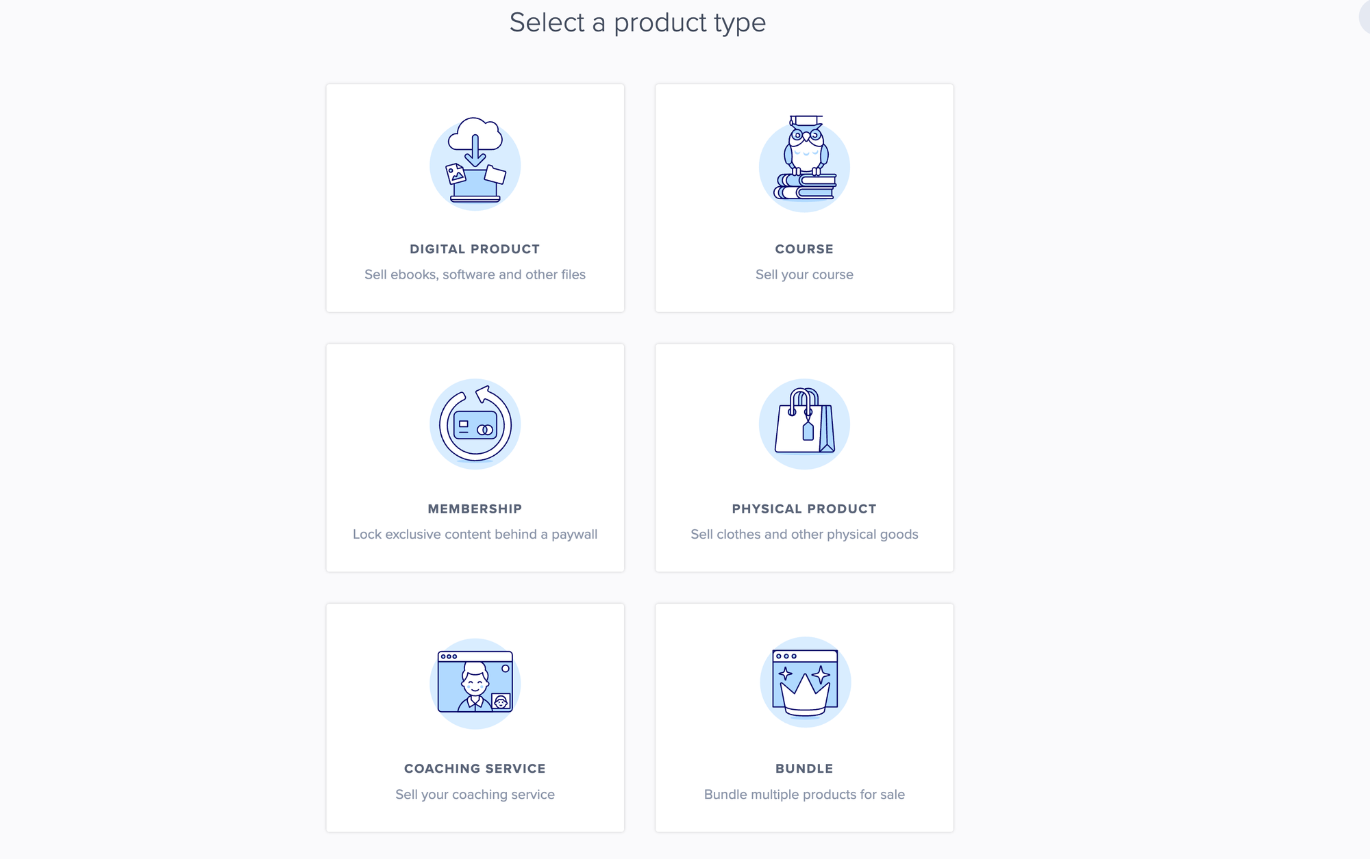Once you have clicked through you come to a page where you select your product type. Like Gumroad, you can choose 'digital product', 'course', 'membership', 'physical product' and 'bundle'. One extra option here is 'coaching service'.