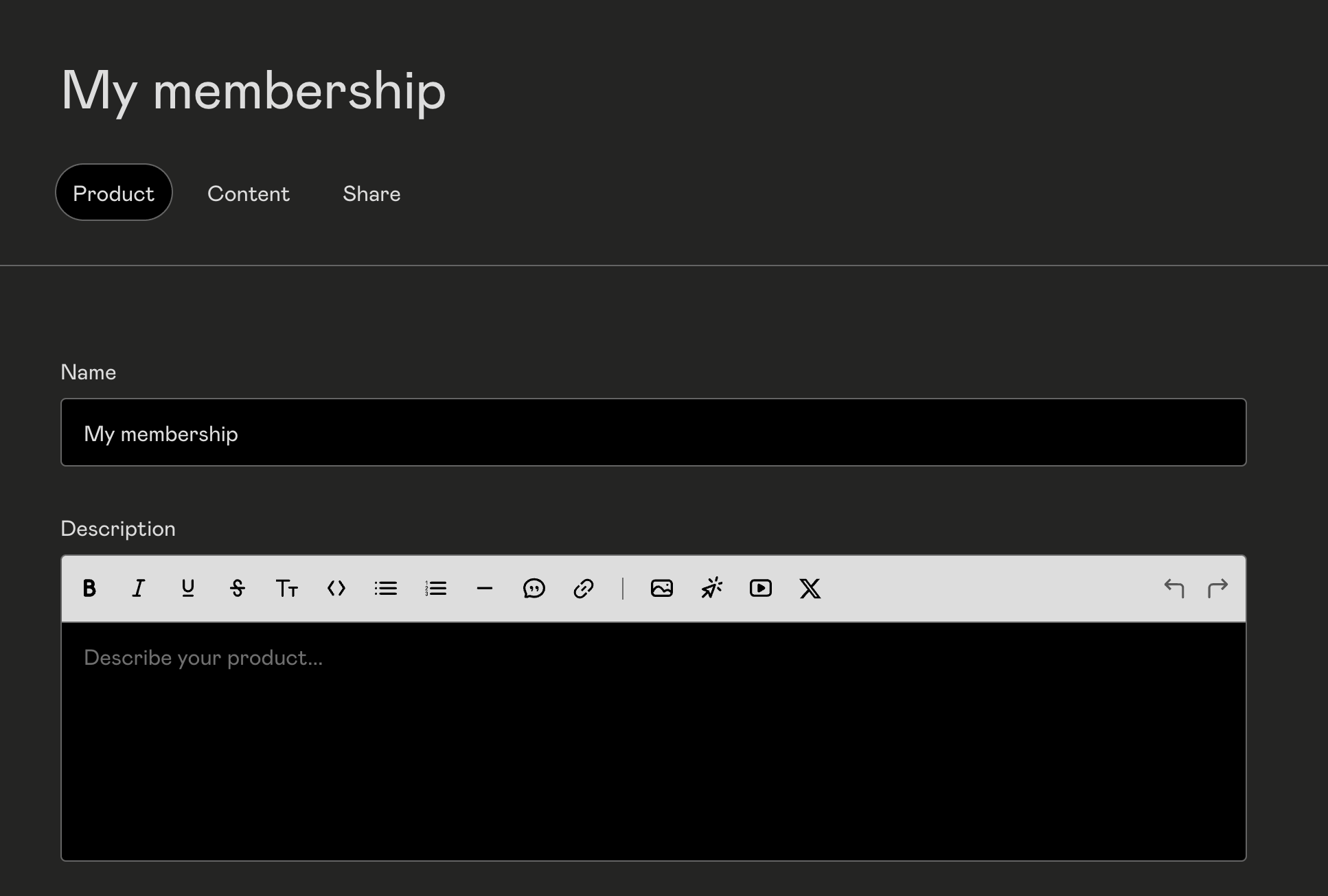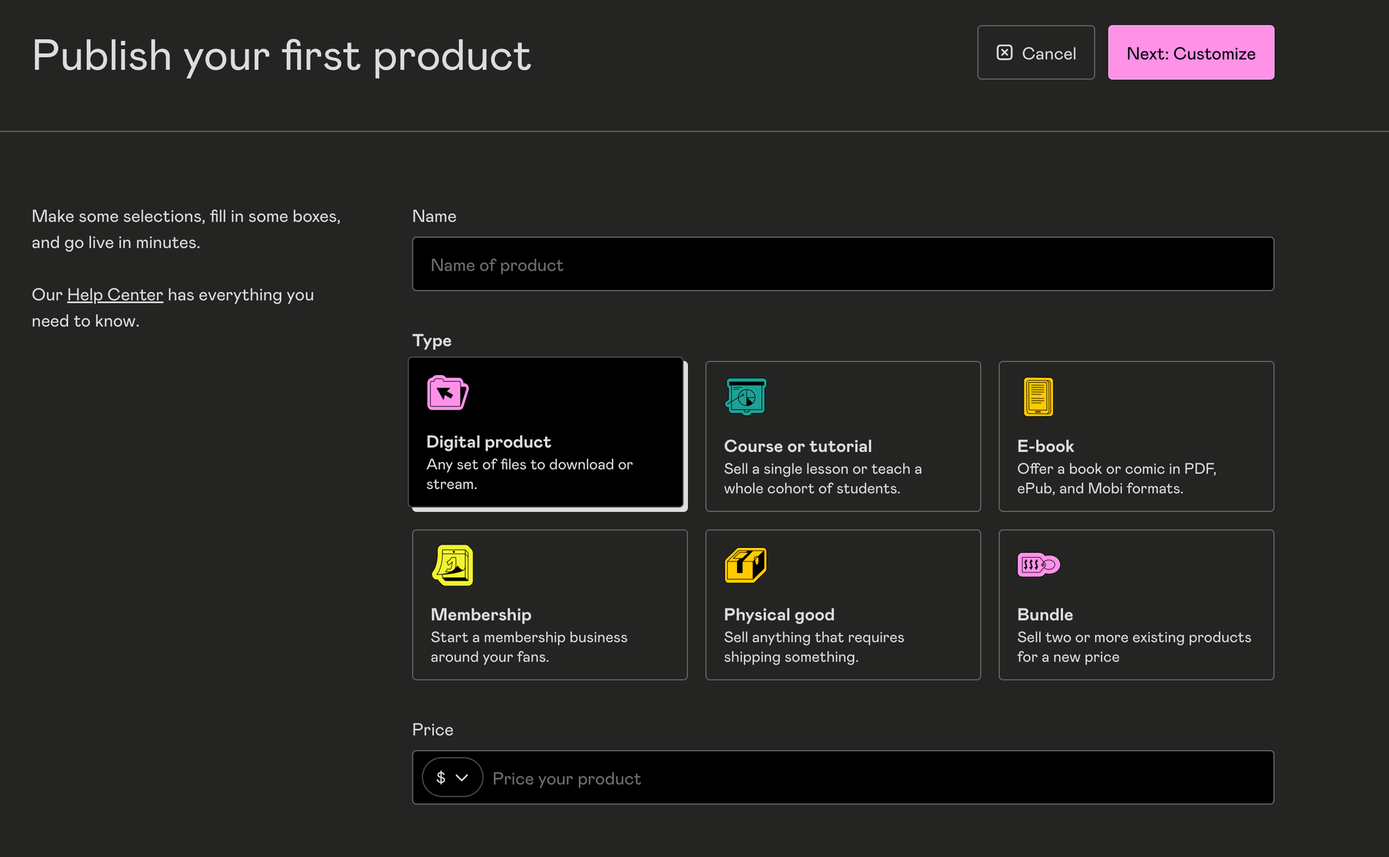 The setup process differs slightly based on the type of product that you are selling. For example, if you're selling a membership then you can set up membership tiers, if you're selling a physical good you can add shipping destinations and SKUs, and with courses and eBooks you can offer alternate versions of the product. However, the setup process is mostly the same across all products.