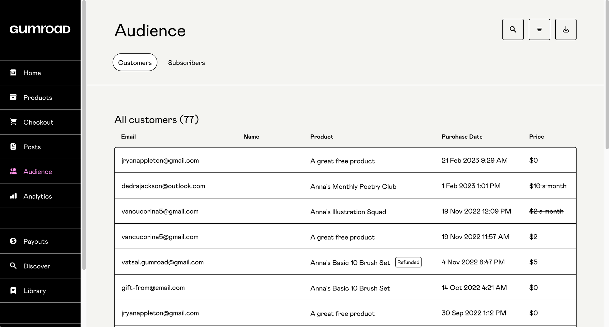 Gumroad has an 'audience dashboard', so each time a new customer purchases one of your products they are added to the 'customers' tab of your audience dashboard, or, if they follow you from your profile, they are added to your 'subscribers' tab. In this dashboard, you can review all of your customers and manage your audience information.