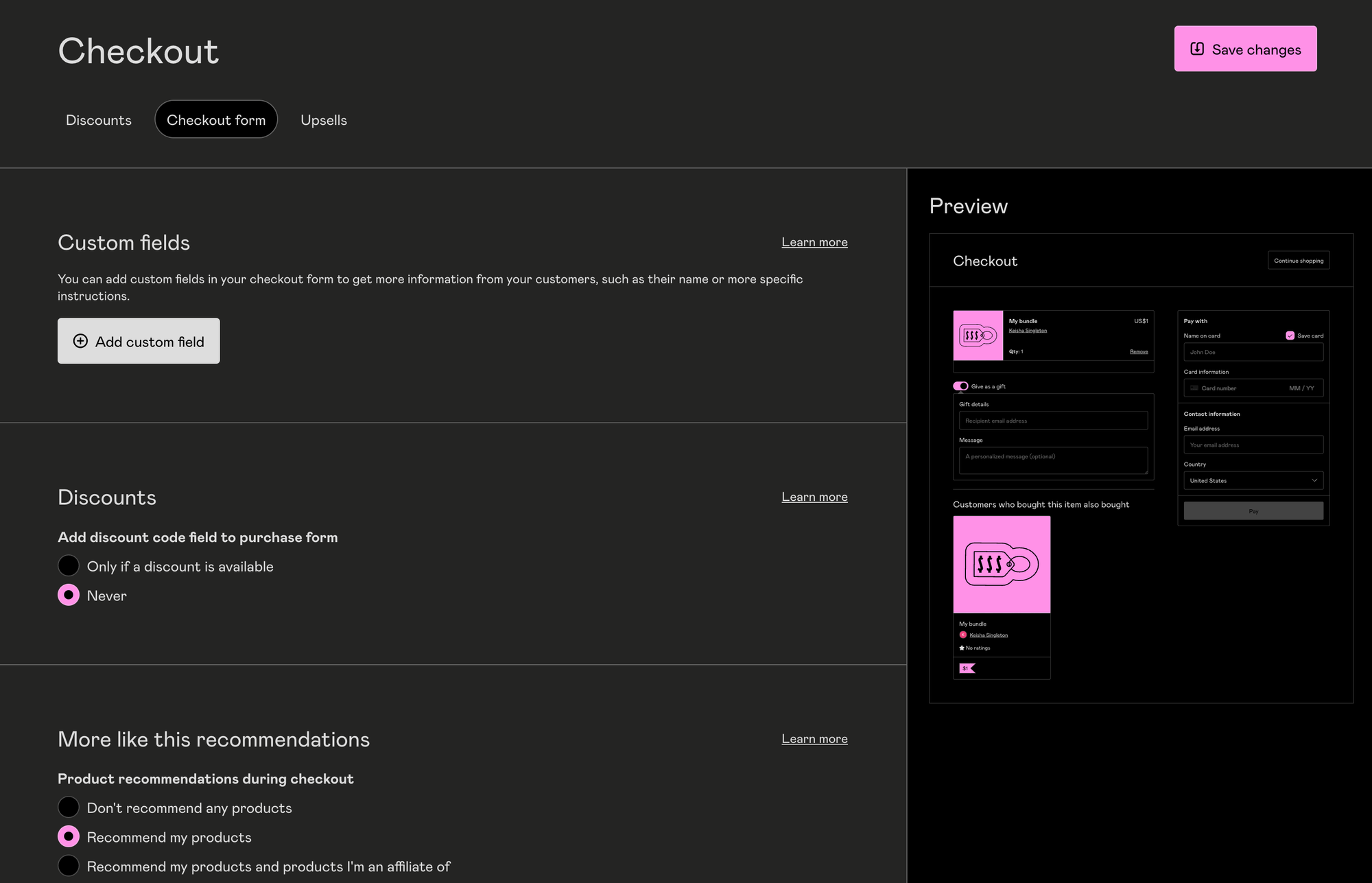 Here you can add custom fields in your checkout form to get more information from your customers (important if you are selling personalized products), offer discount codes, recommend your other products, and offer an upsell or product add-on at checkout