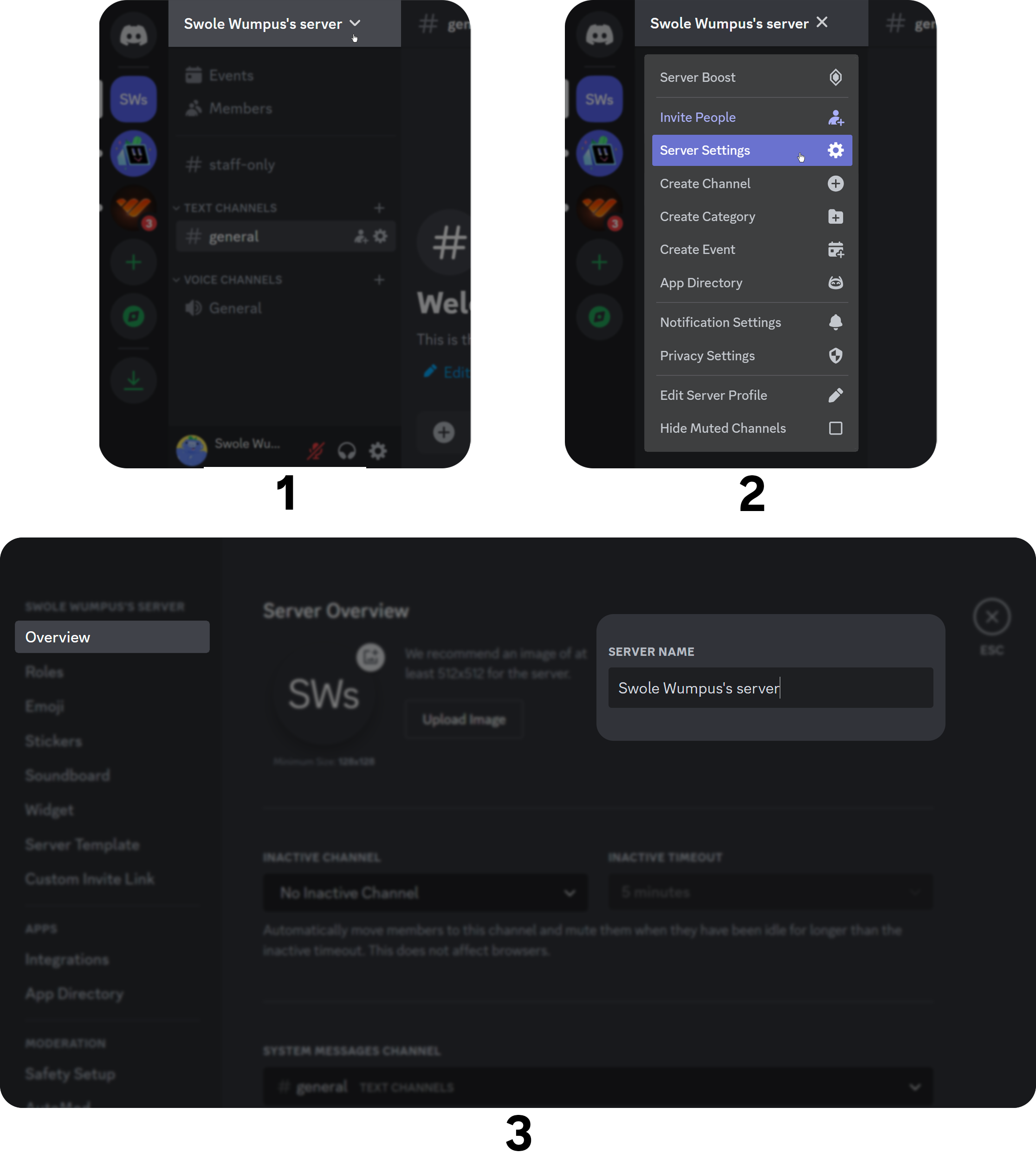 - You can see the Server Name input box in the Overview section of the Server Settings. After setting a server name, click the Save Changes button at the bottom. The character limit of server names are 100.