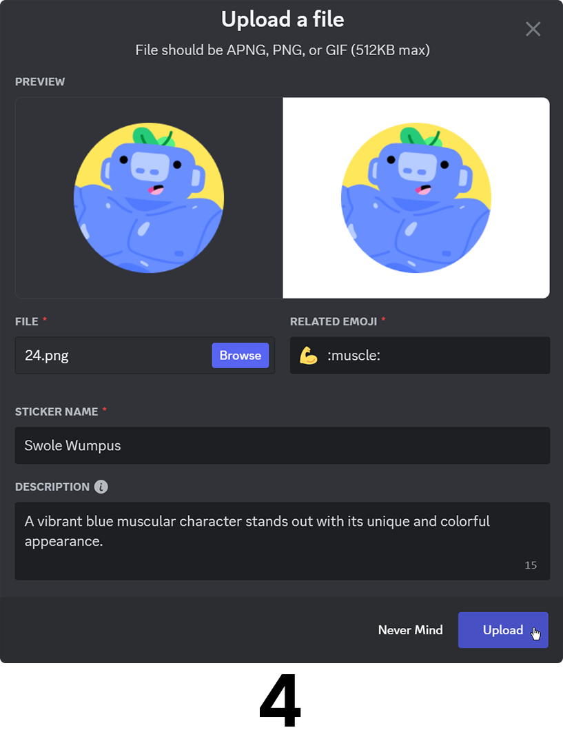 - In the Upload a File prompt, upload a sticker, select a related emoji, give it a name, and optionally write a description (alt text). When you're done, click Upload.