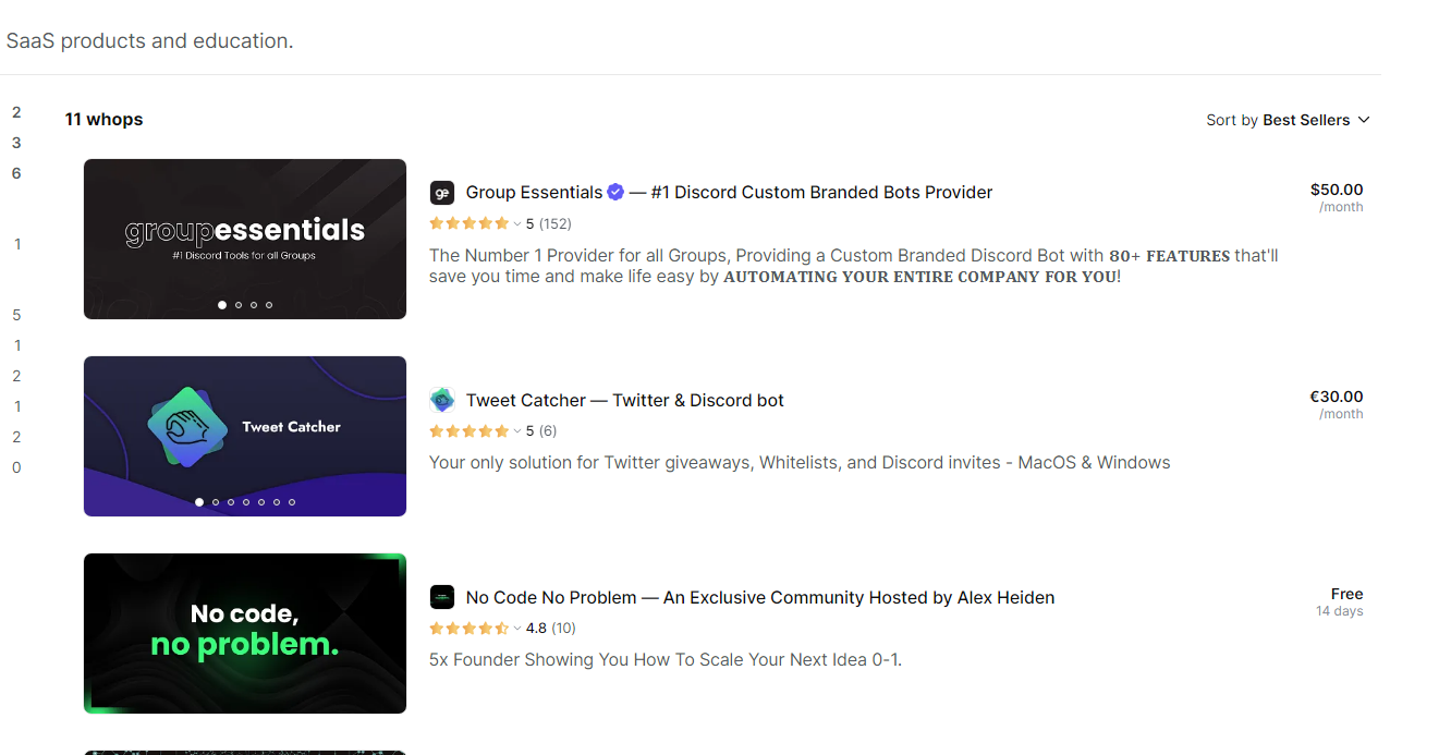 Whop is a platform for selling digital products and SaaS. Be it software, bots, templates, or automation tools, you can use Whop to start selling your SaaS in mere minutes.