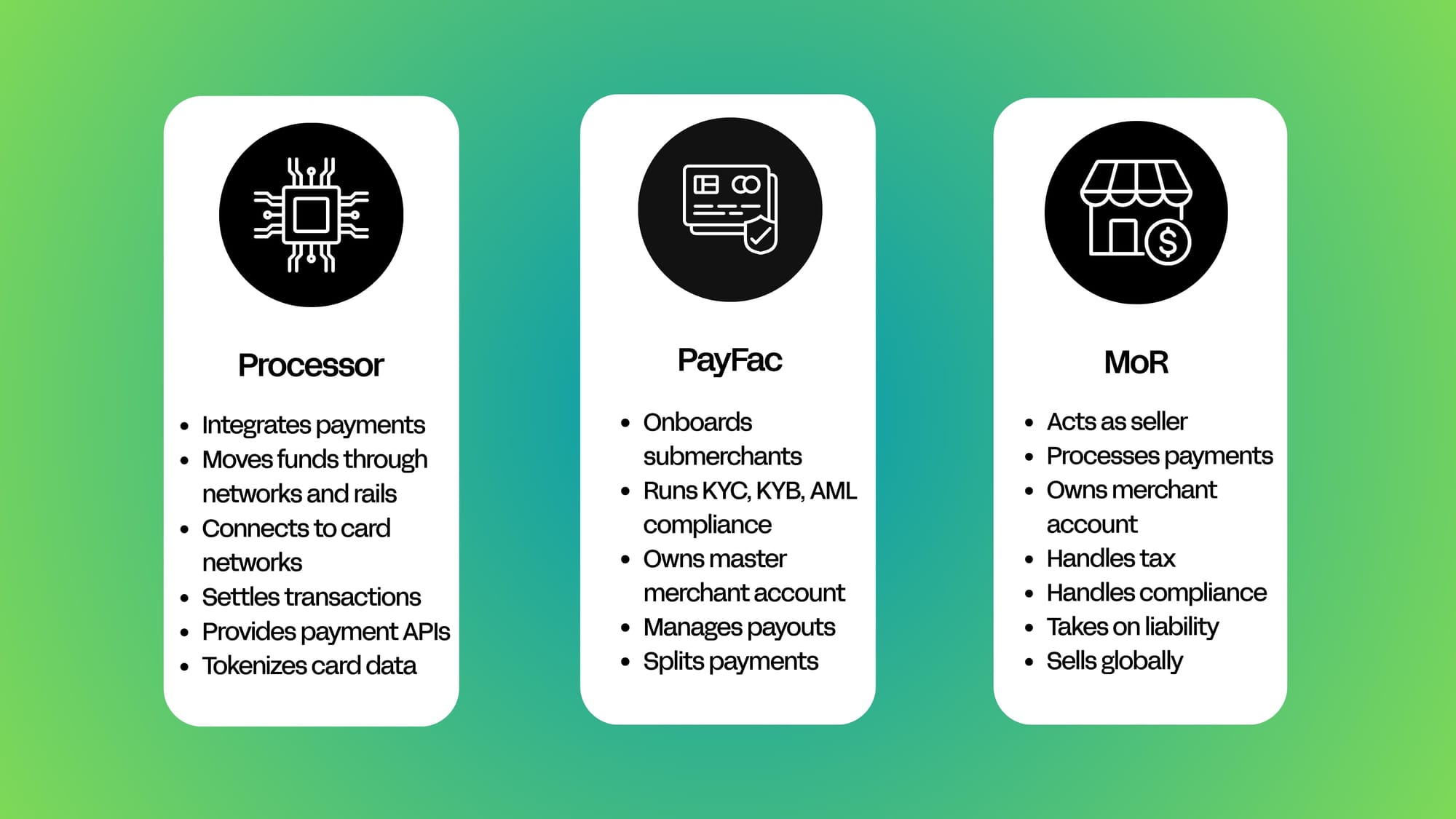 - PayFac-as-a-Service and Merchant of Record models let platforms embed payments without building complex compliance infrastructure themselves.