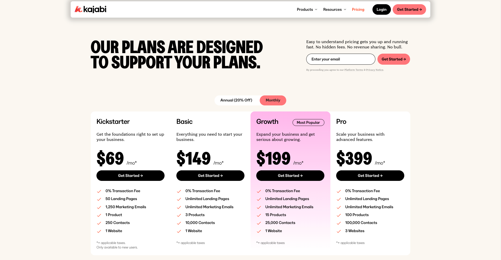 Kajabi’s 4 pricing plans are as follows (all plans come at a discount if you pay annually):