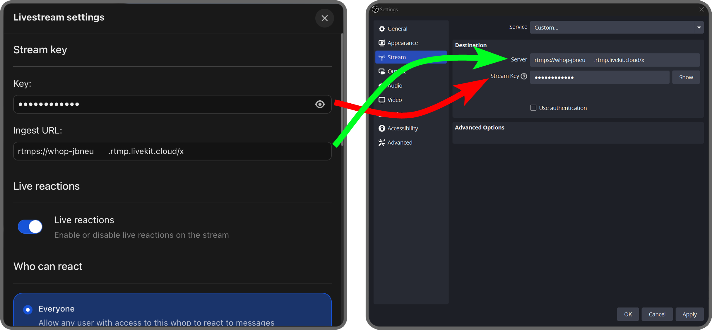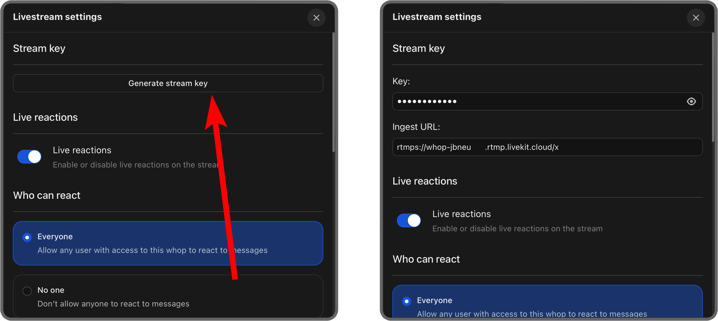 You can think of them as your way of connecting and authenticating your OBS stream to your Whop livestream.