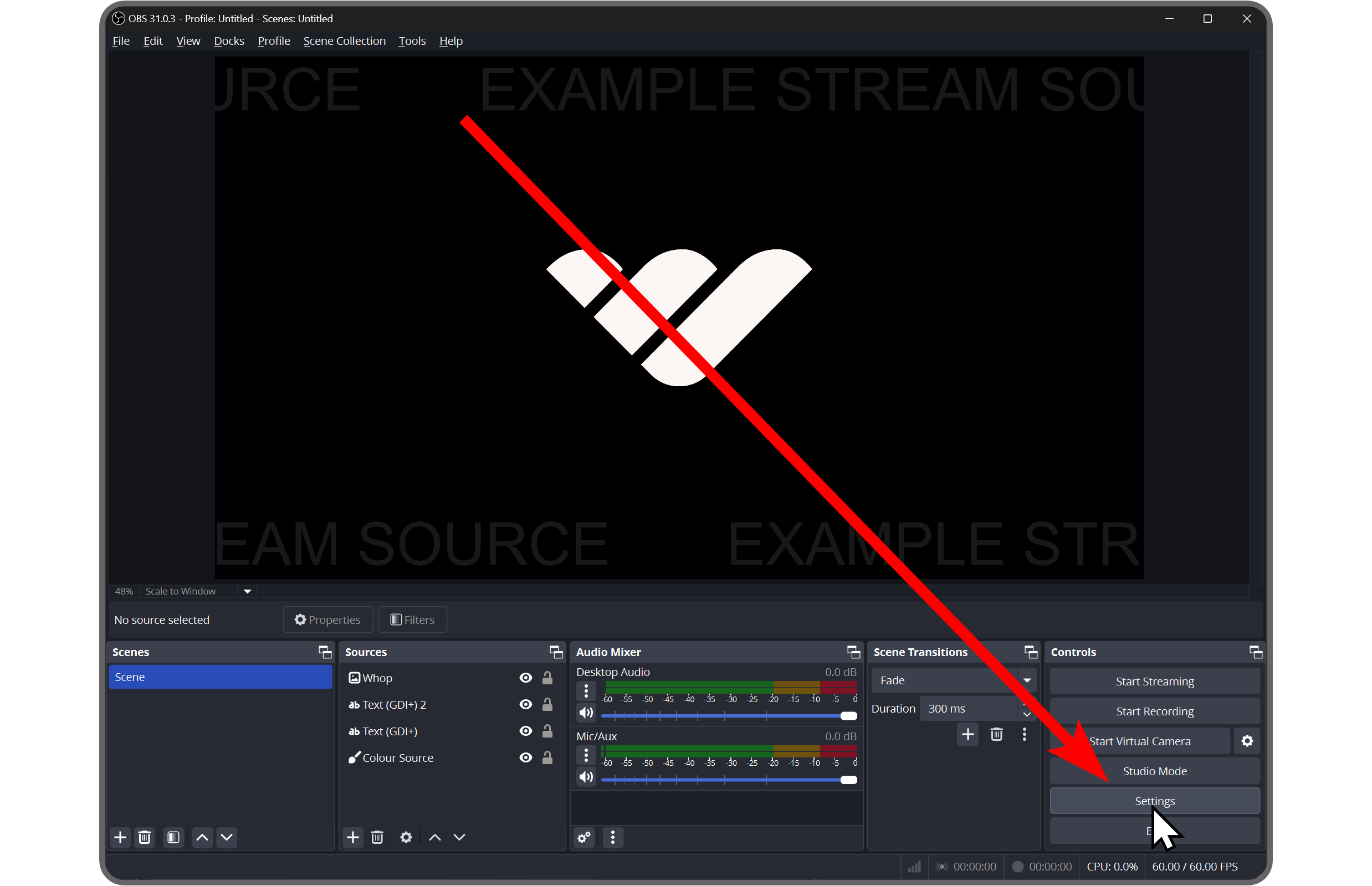 Now that you have a stream key, let's switch to OBS and click on the Settings button. This will display a menu of all the software settings.