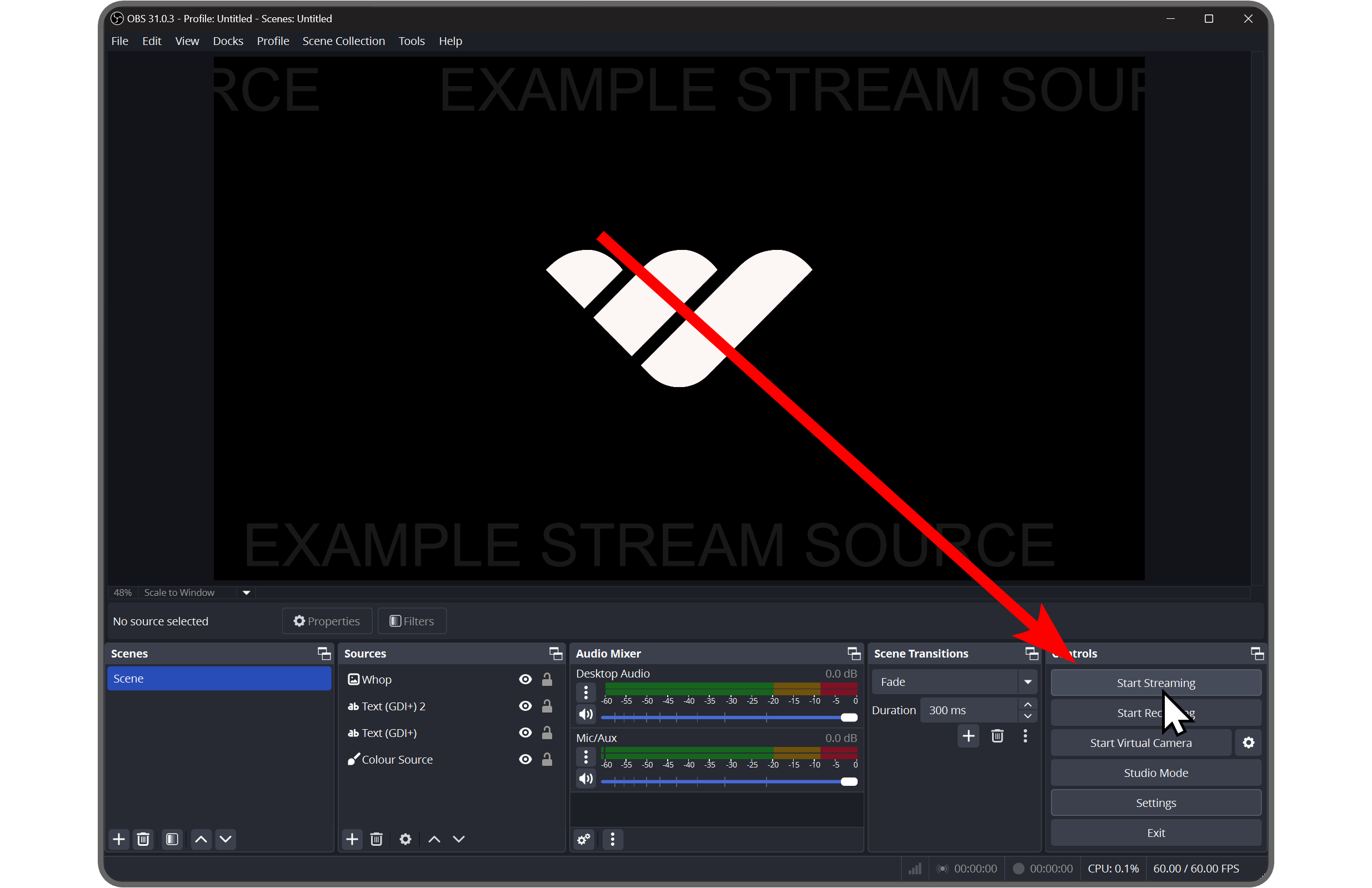 If you ever want to sever the connection between OBS and your Whop livestream, click the Stop Streaming button (this will appear after you start a stream in OBS).